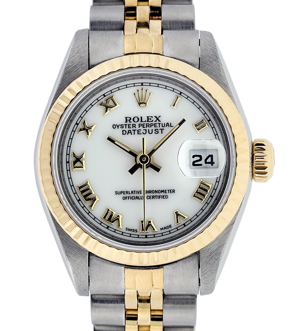 One Ladies Quickset Pre Owned 18K Two Tone Rolex Datejust Polished, Serviced & Electronically Tested, Rolex 18K Yellow Gold & Stainless Steel, Rolex Case: 26mm, Rolex 18K Yellow Gold Crown, Rolex Bezel: 18K Yellow Gold Fluted Bezel. Crystal: Sapphire With Magnified Date Window. Hands: Luminescent Hands. Rolex Movement: Automatic Winding Movement 2235. Rolex Dial: White Roman Dial With Square Track. Date Window: 3 O'Clock Position Date Display, Model: Quickset Datejust. Condition: G-6 Extra Fine. Rolex Bracelet: Two Tone 18K Yellow Gold & Stainless Steel Jubilee Band. Bright Polish. 6.0 Inch Length, Adjustable. Standard Clasp, With Rolex Logo. This Watch Has Been Serviced Time Tested And Is In Excellent Condition It Is Free Of All Scratches And Dents.