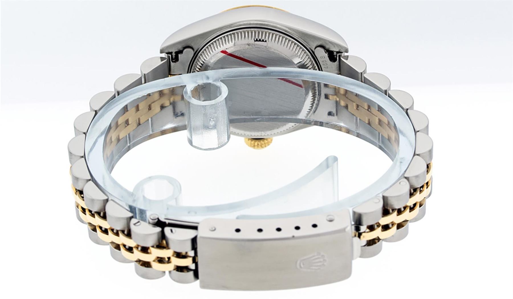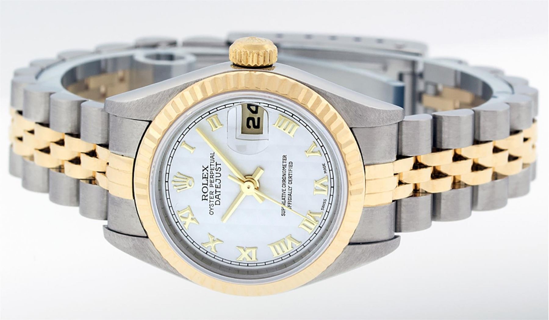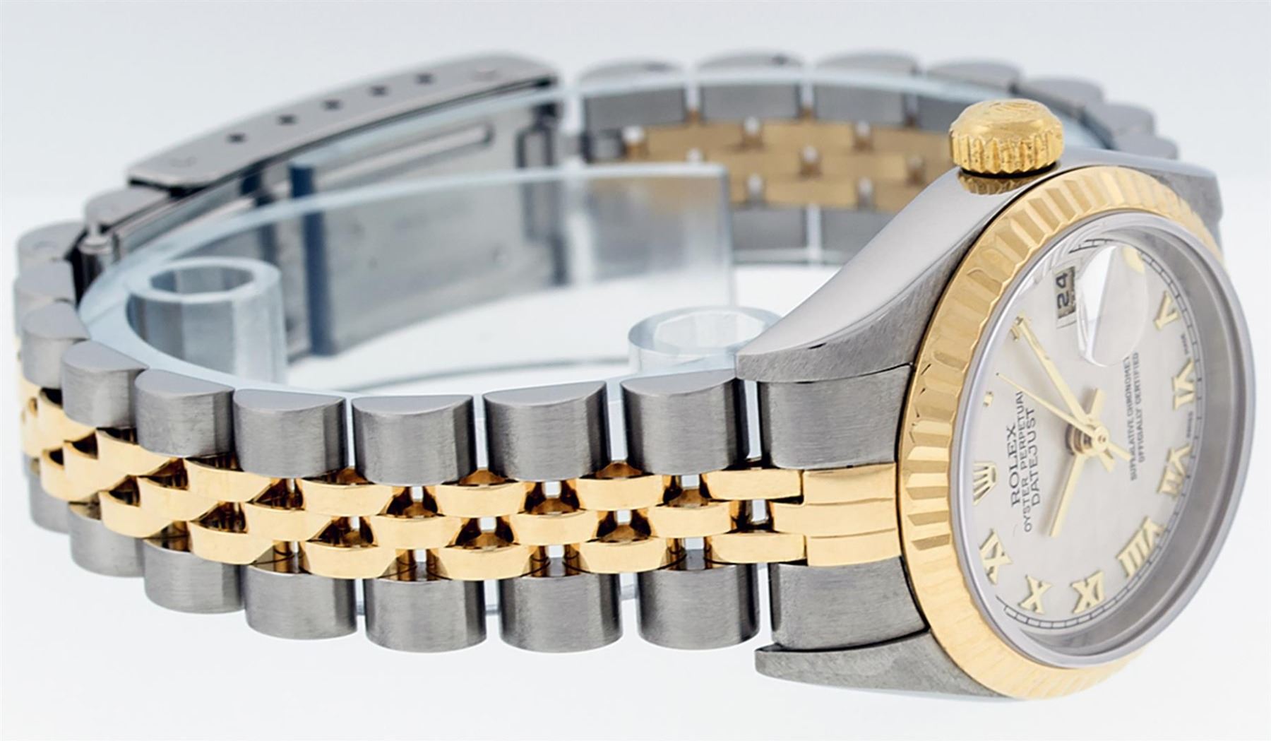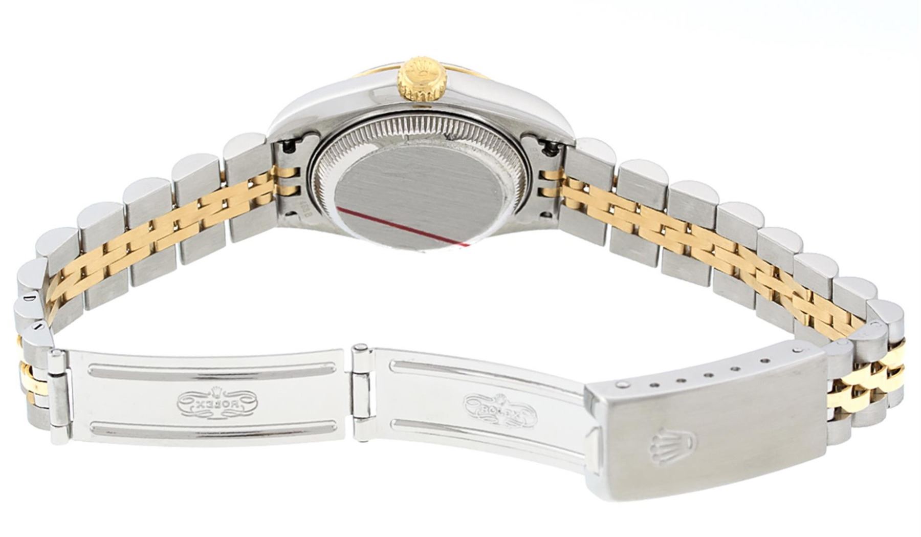 One Ladies Quickset Pre Owned 18K Two Tone Rolex Datejust Polished, Serviced & Electronically Tested, Rolex 18K Yellow Gold & Stainless Steel, Rolex Case: 26mm, Rolex 18K Yellow Gold Crown, Rolex Bezel: 18K Yellow Gold Fluted Bezel. Crystal: Sapphire With Magnified Date Window. Hands: Luminescent Hands. Rolex Movement: Automatic Winding Movement 2235. Rolex Dial: White Roman Dial With Square Track. Date Window: 3 O'Clock Position Date Display, Model: Quickset Datejust. Condition: G-6 Extra Fine. Rolex Bracelet: Two Tone 18K Yellow Gold & Stainless Steel Jubilee Band. Bright Polish. 6.0 Inch Length, Adjustable. Standard Clasp, With Rolex Logo. This Watch Has Been Serviced Time Tested And Is In Excellent Condition It Is Free Of All Scratches And Dents.