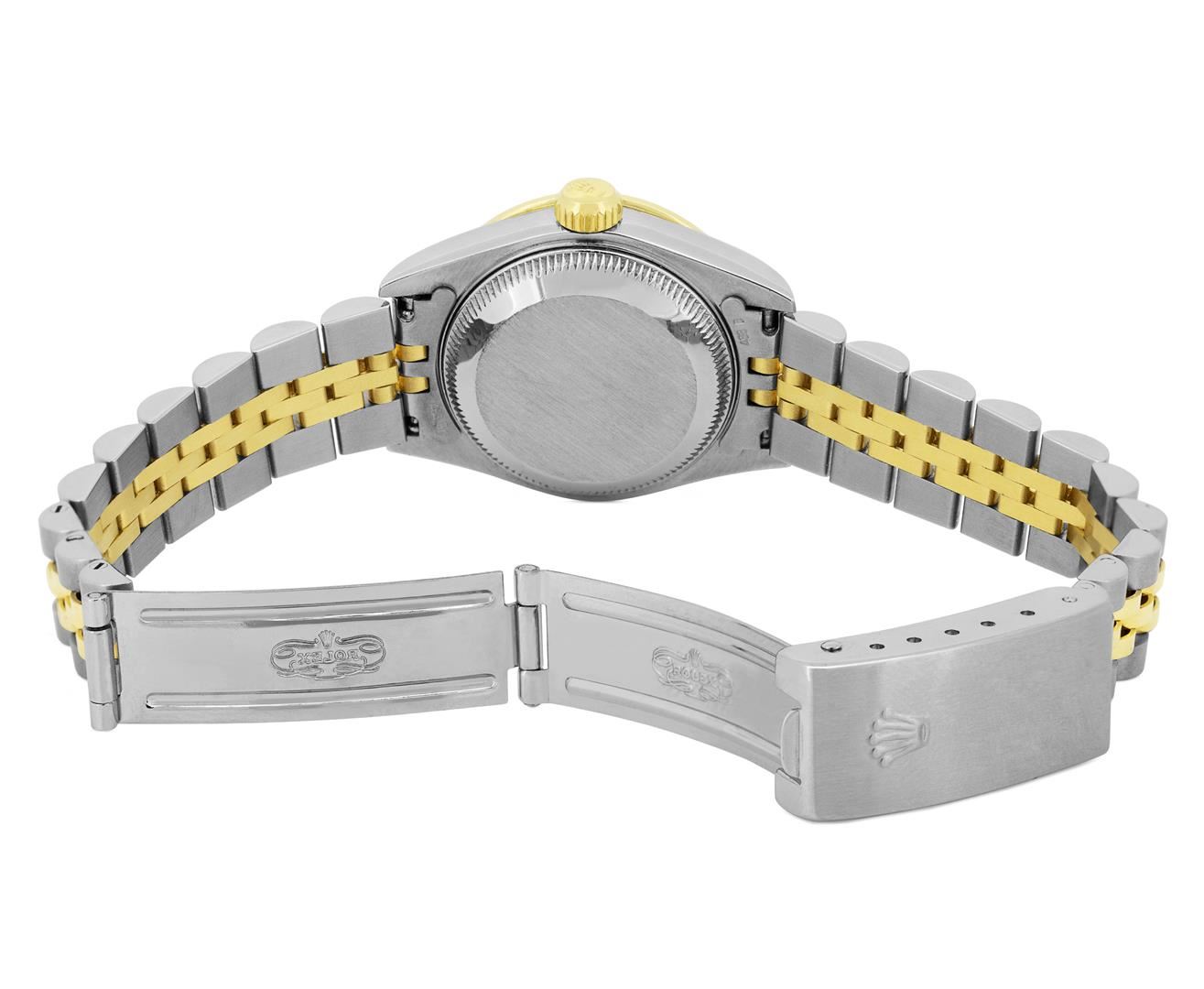 One Rolex Ladies Pre Owned Two Tone 18K Yellow Gold & Stainless Steel Rolex Datejust Polished, Serviced & Electronically Tested, Rolex Yellow Gold & Stainless Steel Case: 26mm, Custom Diamond Lugs: 24 Added Diamonds On Lugs. Rolex Yellow Gold Crown. Custo