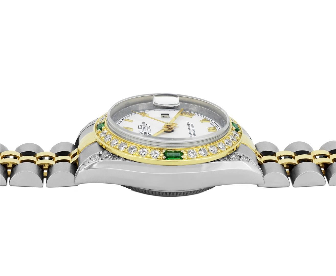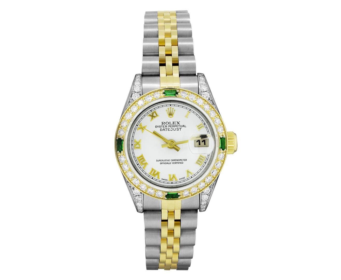 One Rolex Ladies Pre Owned Two Tone 18K Yellow Gold & Stainless Steel Rolex Datejust Polished, Serviced & Electronically Tested, Rolex Yellow Gold & Stainless Steel Case: 26mm, Custom Diamond Lugs: 24 Added Diamonds On Lugs. Rolex Yellow Gold Crown. Custom Bezel: New 18K Yellow Gold Emerald Beadset Diamond Bezel, Diamond + Gem Count: 36 Diamonds + 4 Emeralds, Clarity: SI-VS, Color: G to H. Crystal: Sapphire Crystal With Date Window. Hands: Custom Hands: New Luminescent Hands. Rolex Movement: Automatic Winding Movement 2235. Rolex Factory Dial: White With Roman Markers And Square Track. Date Window: 3 O'Clock Position Date Display, Condition: G-6 Extra Fine. Rolex Bracelet: Two Tone 18K Yellow Gold & Stainless Steel Jubilee Band. Bright Polish & Satin Finish. 6.0 Inch Length, Adjustable. Standard Clasp, With Rolex Logo. This Watch Has Been Serviced And Time Tested. It Is In Excellent Condition, Free Of All Scratches And Dents. The Watch Comes With A Rolex Box.