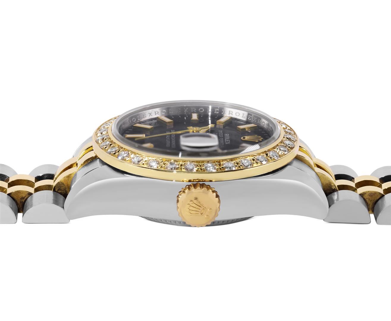 One Rolex Ladies Pre Owned Two Tone 18K Yellow Gold & Stainless Steel Rolex Datejust Polished, Serviced & Electronically Tested, Rolex Yellow Gold & Stainless Steel Case: 26mm, Rolex Yellow Gold Crown. Custom Bezel: New 18K Yellow Gold Beadset Diamond Bezel, Diamond Count: 32 Diamonds On Bezel. Crystal: Sapphire Crystal With Date Window. Hands: Luminescent Hands. Rolex Movement: 2235 Automatic Winding Movement. Rolex Factory Dial: Black Luminous Index Dial with Dash Track. Date Window: 3 O'Clock Position Date Display, Condition: G-6 Extra Fine. Rolex Bracelet: Two Tone 18K Yellow Gold & Stainless Steel Jubilee Band With Hidden Clasp. Bright Polish & Satin Finish. 6.0 Inch Length, Adjustable. Hidden Clasp, With Rolex Logo. This Watch Has Been Serviced Time Tested And Is In Excellent Condition It Is Free Of All Scratches And Dents. This Watch Comes With A Rolex Box.