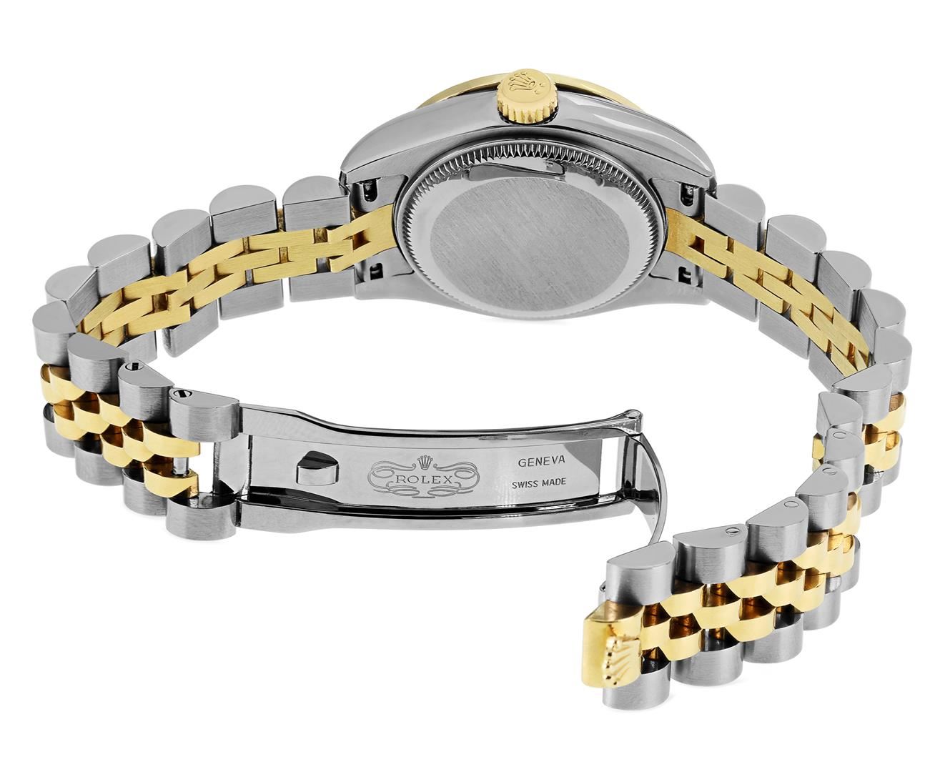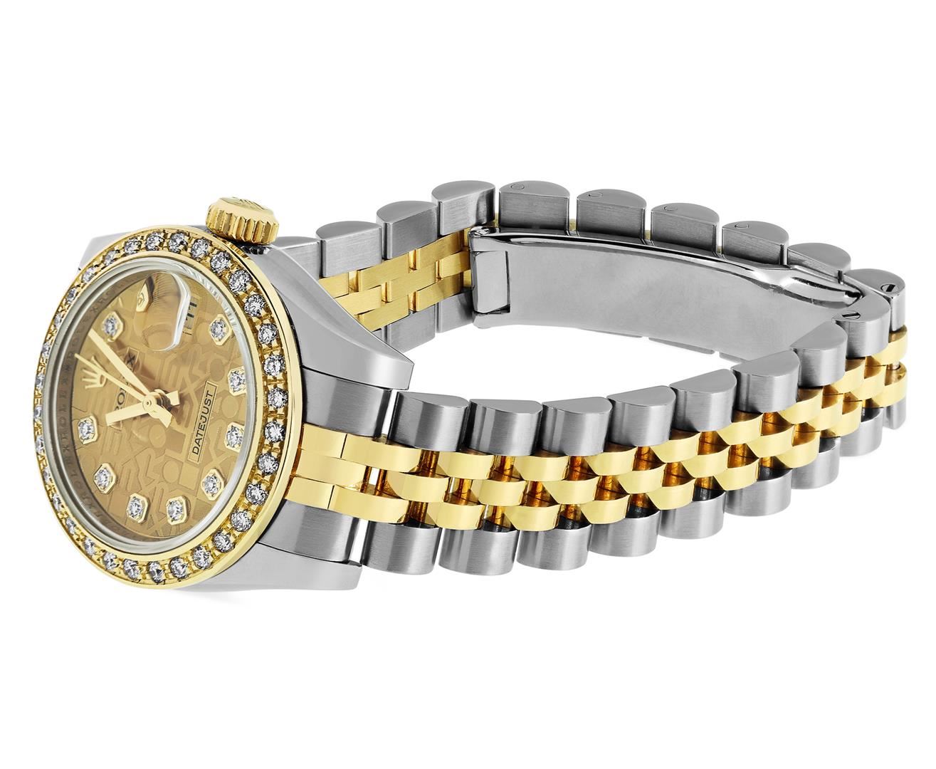 One Rolex Ladies Pre Owned Two Tone 18K Yellow Gold & Stainless Steel Rolex Datejust Polished, Serviced & Electronically Tested, Rolex Yellow Gold & Stainless Steel Case: 26mm, Rolex Yellow Gold Crown. Custom Bezel: New 18K Yellow Gold Beadset Diamond Bez