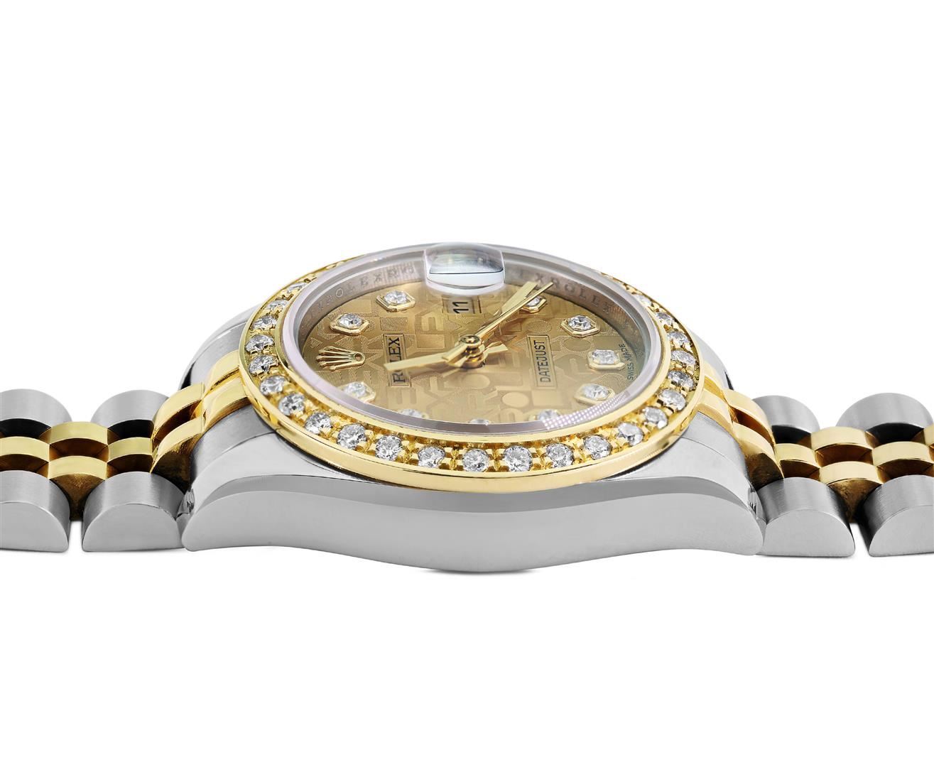 One Rolex Ladies Pre Owned Two Tone 18K Yellow Gold & Stainless Steel Rolex Datejust Polished, Serviced & Electronically Tested, Rolex Yellow Gold & Stainless Steel Case: 26mm, Rolex Yellow Gold Crown. Custom Bezel: New 18K Yellow Gold Beadset Diamond Bez
