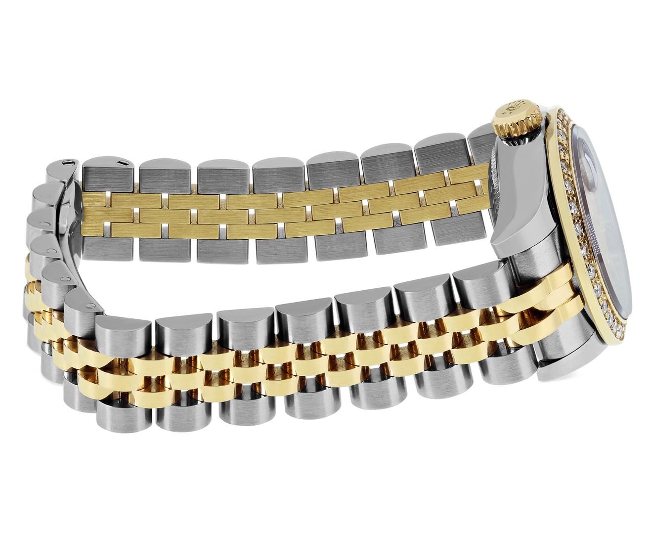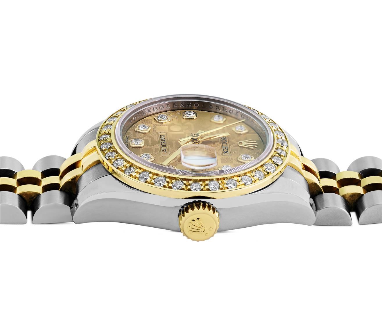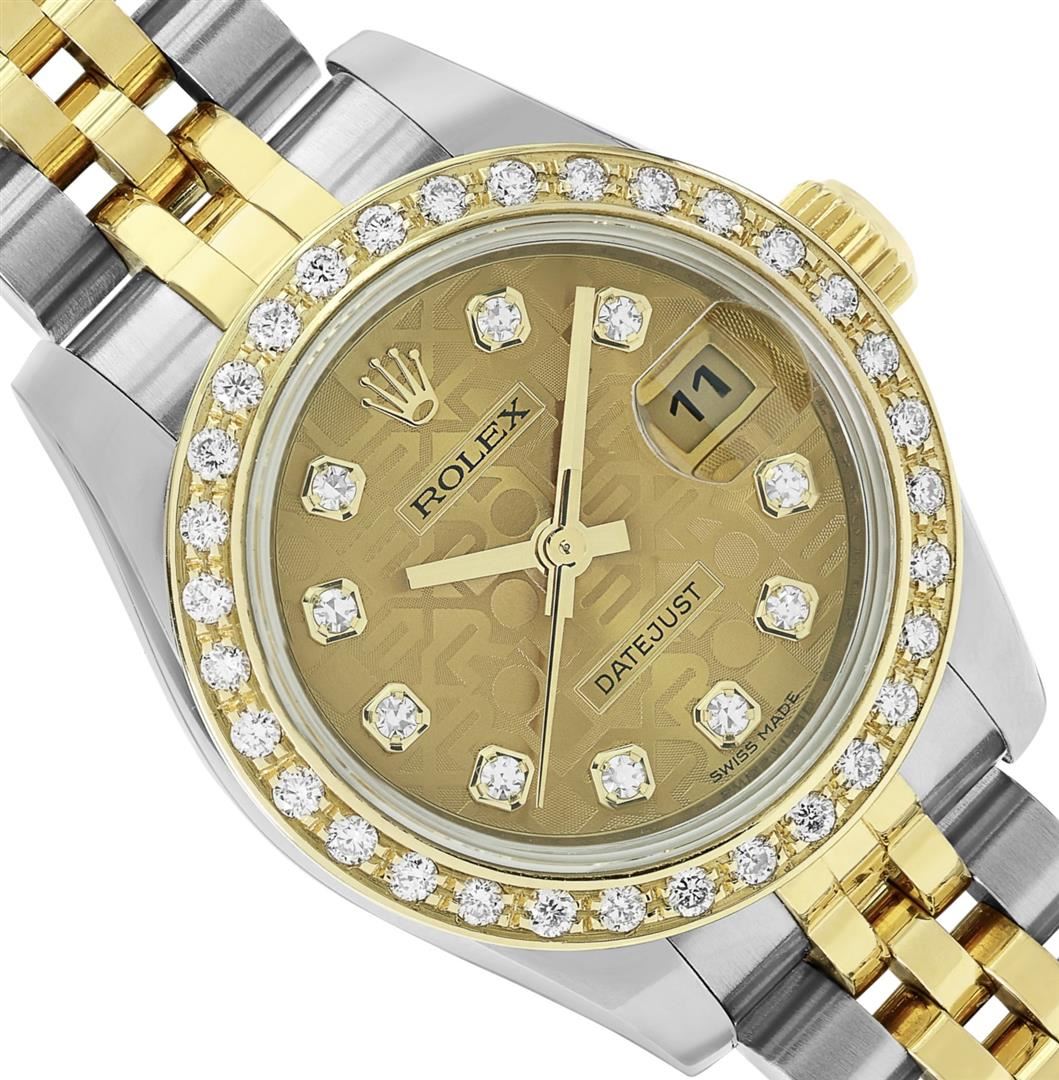 One Rolex Ladies Pre Owned Two Tone 18K Yellow Gold & Stainless Steel Rolex Datejust Polished, Serviced & Electronically Tested, Rolex Yellow Gold & Stainless Steel Case: 26mm, Rolex Yellow Gold Crown. Custom Bezel: New 18K Yellow Gold Beadset Diamond Bezel, Diamond Count: 32 Diamonds On Bezel. Crystal: Sapphire Crystal With Date Window. Hands: Solid Hands. Rolex Movement: 2235 Automatic Winding Movement. Rolex Factory Dial: Factory Champagne Jubilee Diamond Dial. Date Window: 3 O'Clock Position Date Display, Condition: G-6 Extra Fine. Rolex Bracelet: Two Tone 18K Yellow Gold & Stainless Steel Jubilee Band With Hidden Clasp. Bright Polish & Satin Finish. 6.0 Inch Length, Adjustable. Hidden Clasp, With Rolex Logo. This Watch Has Been Serviced Time Tested And Is In Excellent Condition It Is Free Of All Scratches And Dents. This Watch Comes With A Rolex Box.