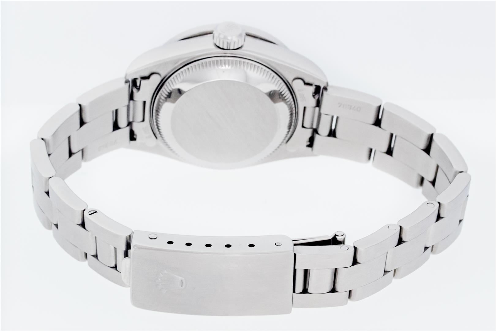 One Ladies Pre Owned Quickset Stainless Steel Rolex Datejust Polished Bright with Satin Finish, Serviced & Electronically Tested, Stainless Steel Case: 26mm, Rolex Stainless Steel Crown, Custom Bezel: New Stainless Steel Bead Set Diamond Bezel, Diamond Count: 40 Diamonds, Clarity: SI-VS, Color: G to H. Custom Crystal: New Sapphire With Magnified Date Window. Custom Hands: New Luminescent Hands. Rolex Movement: Automatic Winding Movement 2235. Rolex Dial: Black With Index Hour Markers & Dash Track. Date Window: 3 O'Clock Position Date Display, Model: Quickset Datejust. Condition: G-6 Extra Fine. Rolex Bracelet: Stainless Steel Oyster Band. Bright Polish & Satin Finish. 6.0 Inch Length, Adjustable. Standard Clasp, With Rolex Logo. This Watch Has Been Serviced Time Tested And Is In Excellent Condition It Is Free Of All Scratches And Dents.