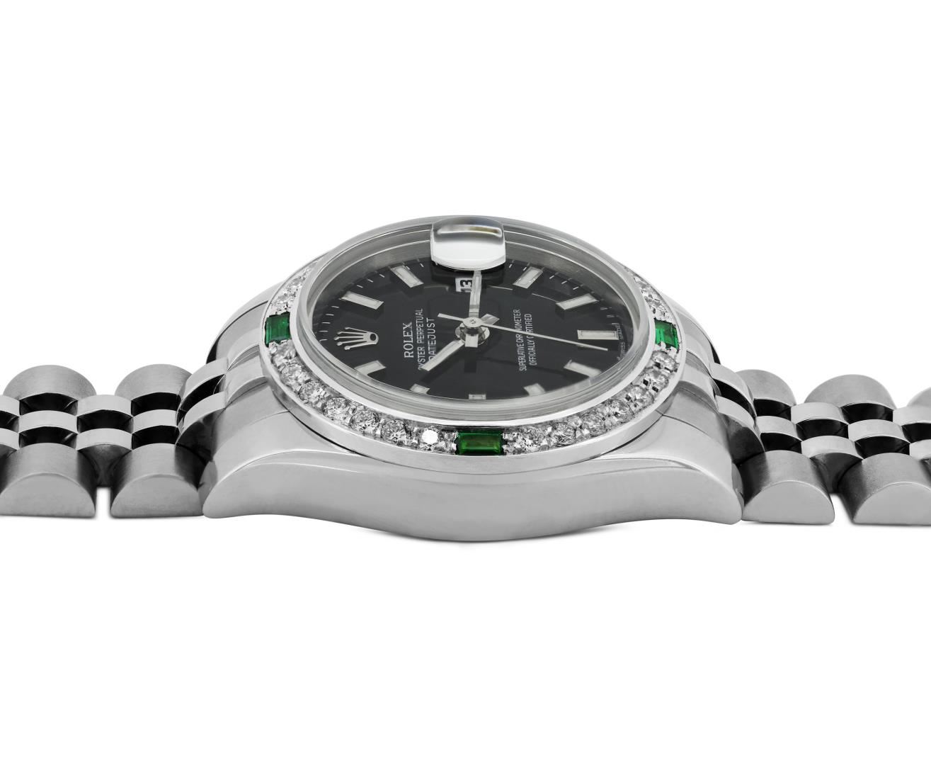 One Rolex Ladies Pre Owned Quickset Stainless Steel Date Wristwatch Polished Bright with Satin Finish, Serviced And Electronically Tested, Stainless Steel Case: 26mm, Stainless Steel Crown, Custom Bezel: New 18K White Gold Emerald Beadset Diamond Bezel, Diamond + Gem Count: 36 Diamonds + 4 Emeralds. Crystal: Sapphire With Magnified Date Window. Hands: Luminescent Hands. Rolex Movement: 2235 Automatic Winding Movement. Rolex Dial: Factory Black With Index Hour Markers And Dash Tracks. Date Window: 3 O'Clock Position Date Display, Model: Sapphire Quickset Date. Condition: G-6 Extra Fine. Rolex Bracelet: Stainless Steel Jubilee Band. Bright Polish & Satin Finish. 6.0 Inch Length, Adjustable. Hidden Clasp, With Rolex Logo. This Watch Has Been Serviced And Time Tested. It Is In Excellent Condition, Free Of All Scratches And Dents. This Watch Comes With A Rolex Box.