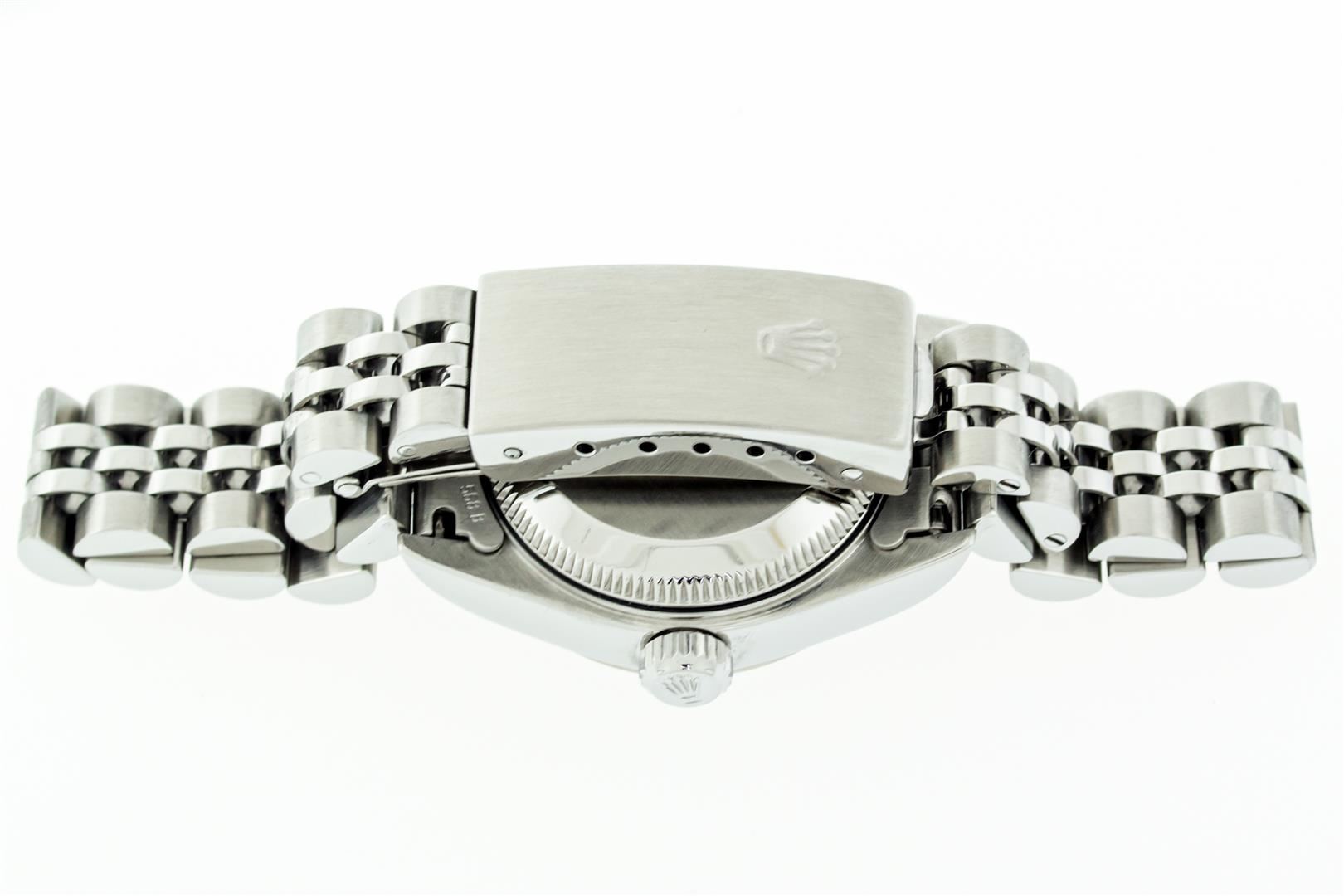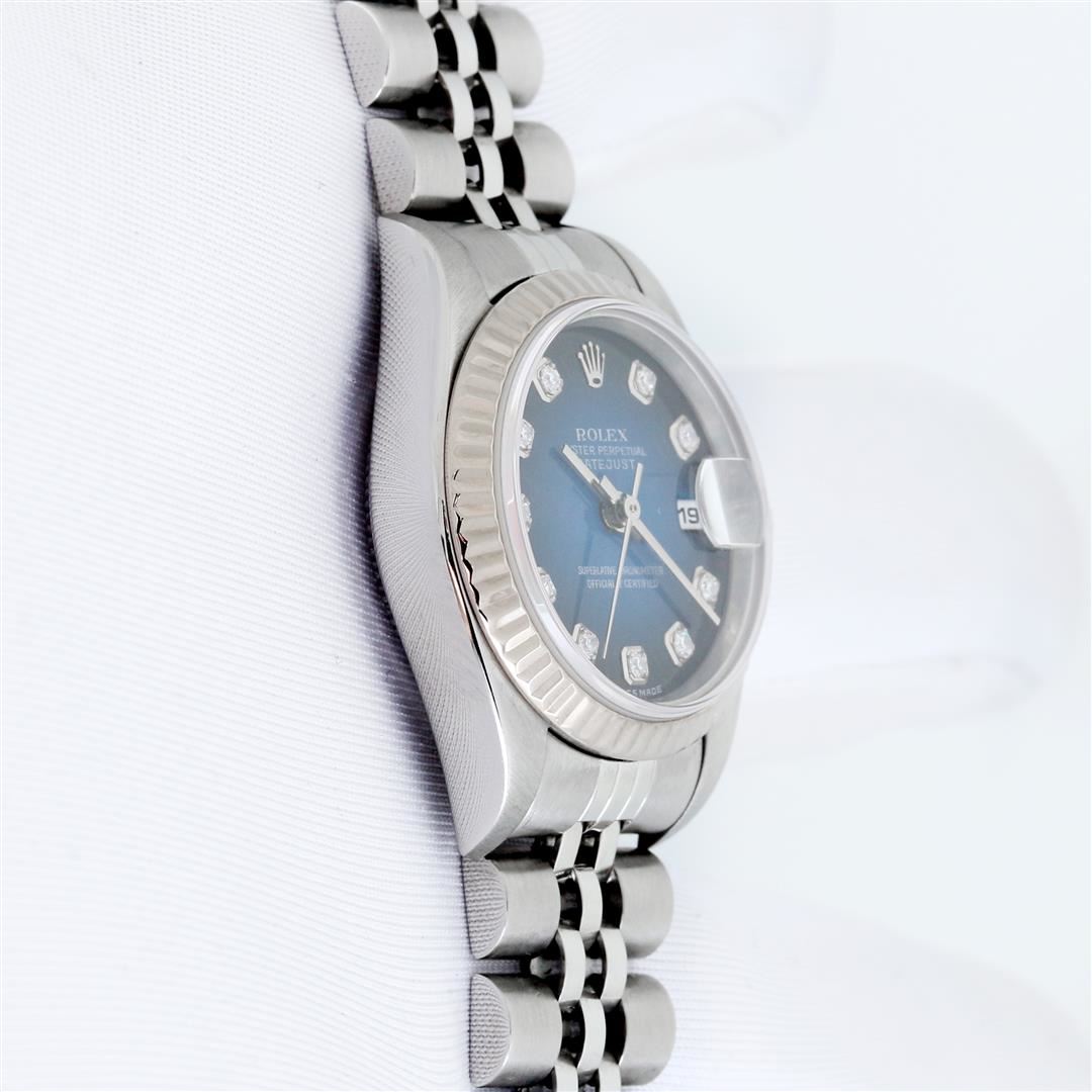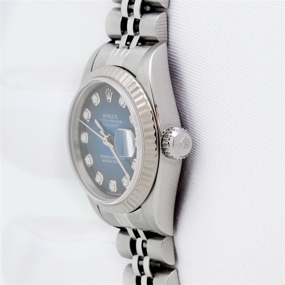 One Ladies Pre Owned Quickset Stainless Steel Rolex Datejust Polished Bright with Satin Finish, Serviced & Electronically Tested, Stainless Steel Case: 26mm, Rolex Stainless Steel Crown, Rolex Bezel: 18K White Gold Fluted Bezel. Custom Crystal: New Sapphire With Magnified Date Window. Custom Hands: New Hands. Rolex Movement: Automatic Winding Movement 2235. Custom Dial: Refinished To Blue Vignette With Custom Added Diamond Hour Markers, Diamond Count: 10 Diamonds On Dial. Date Window: 3 O'Clock Position Date Display, Model: Quickset Datejust. Condition: G-6 Extra Fine. Rolex Bracelet: Stainless Steel Jubilee Band. Bright Polish & Satin Finish. 6.0 Inch Length, Adjustable. Standard Clasp, With Rolex Logo. This Watch Has Been Serviced Time Tested And Is In Excellent Condition It Is Free Of All Scratches And Dents.