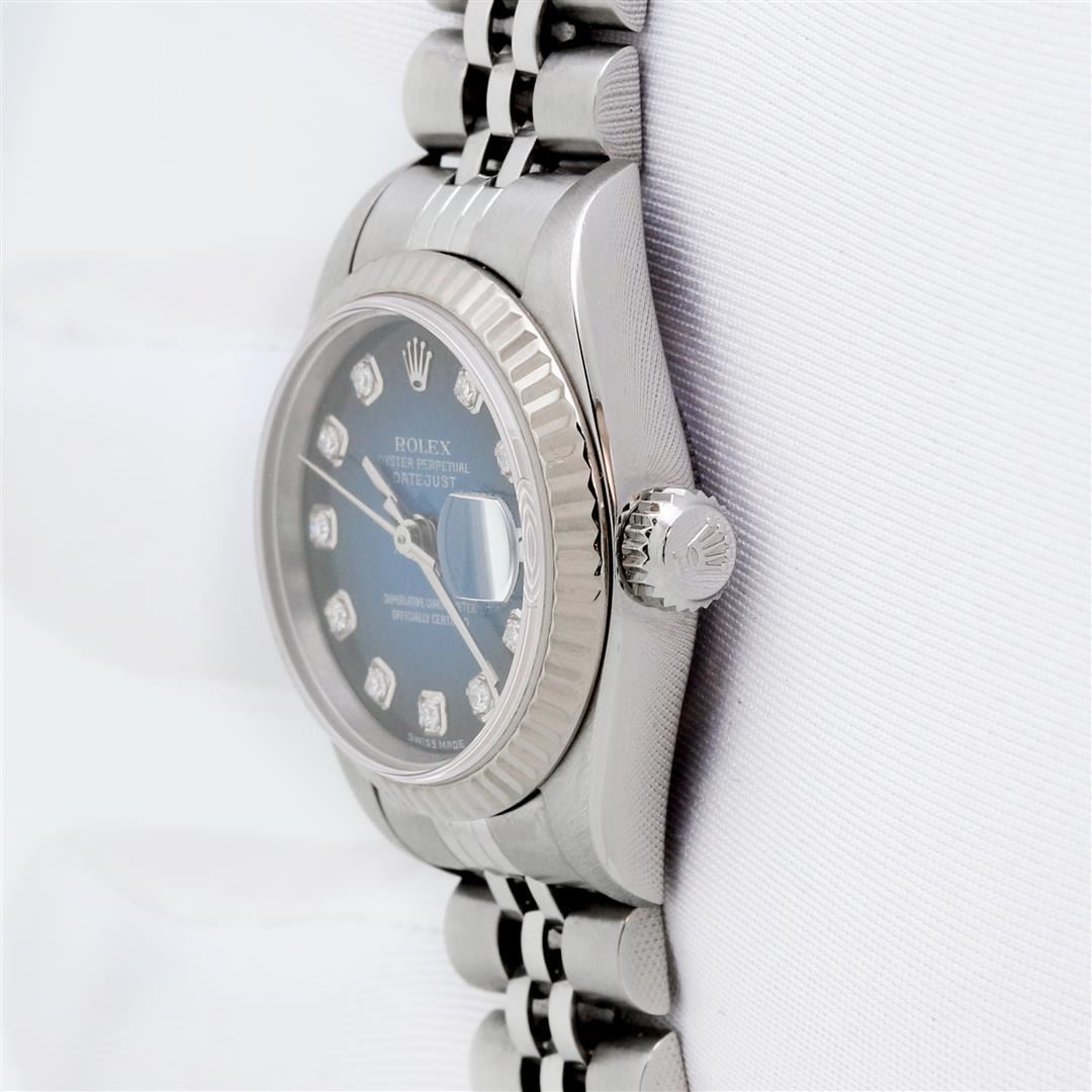 One Ladies Pre Owned Quickset Stainless Steel Rolex Datejust Polished Bright with Satin Finish, Serviced & Electronically Tested, Stainless Steel Case: 26mm, Rolex Stainless Steel Crown, Rolex Bezel: 18K White Gold Fluted Bezel. Custom Crystal: New Sapphi