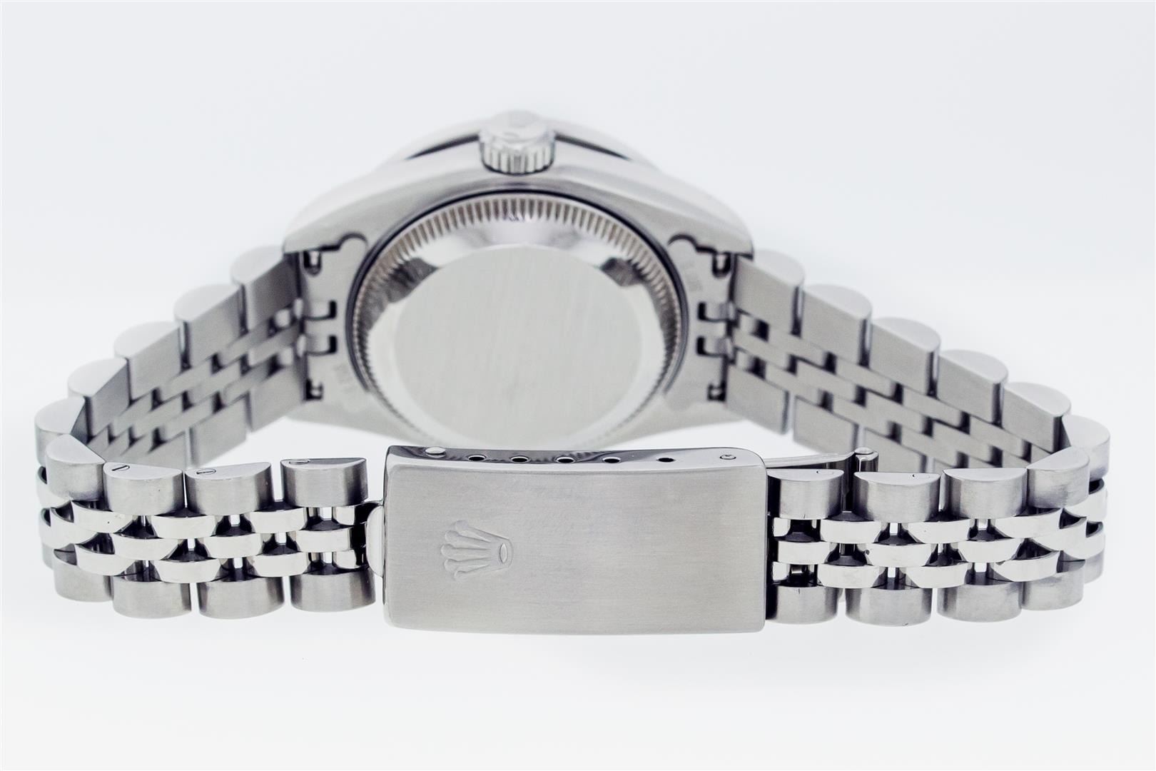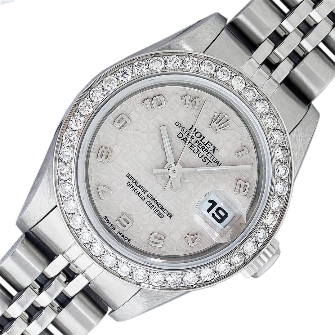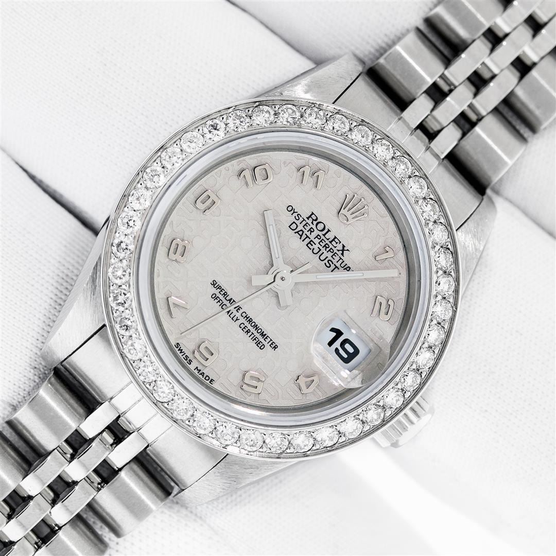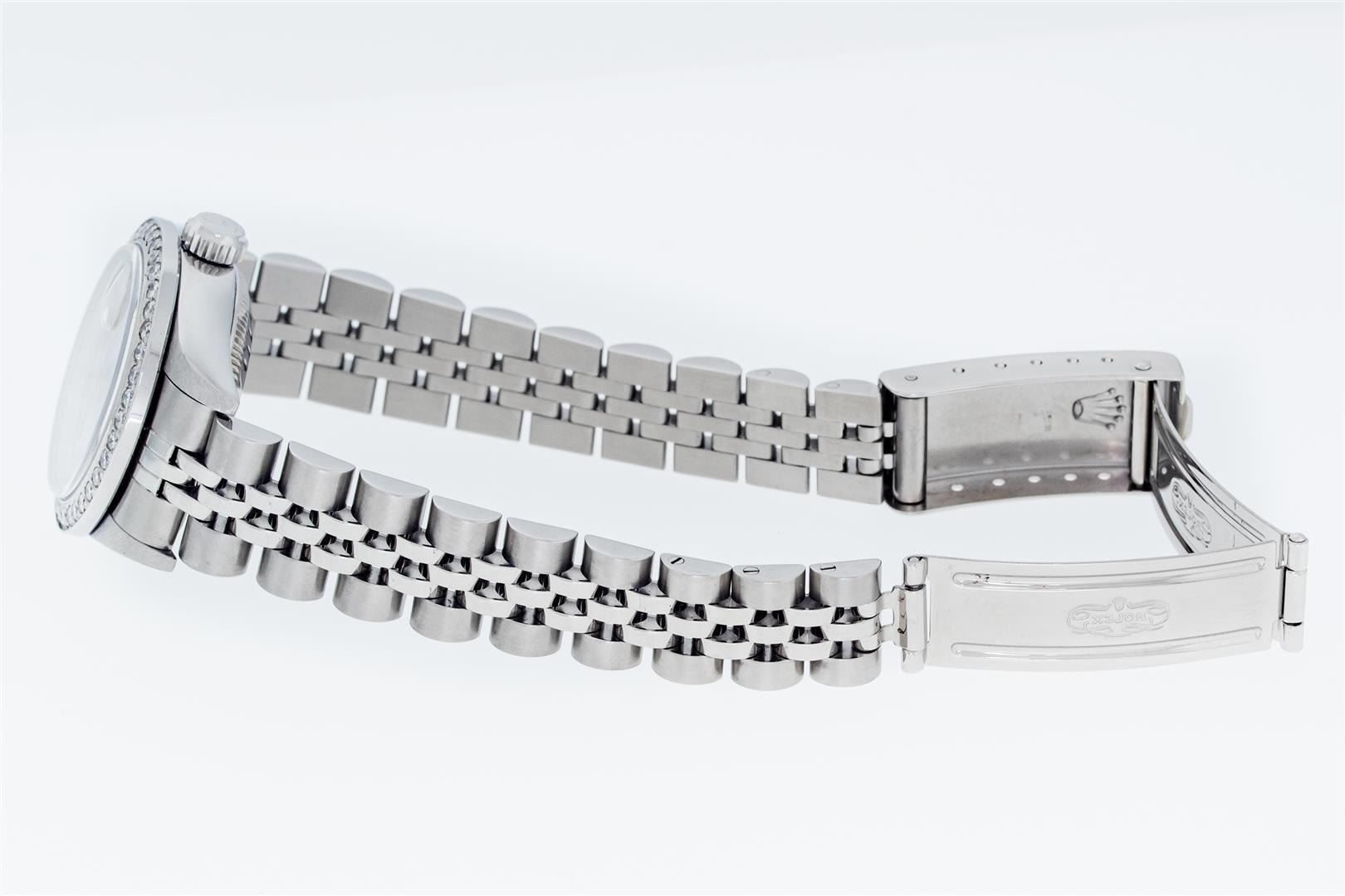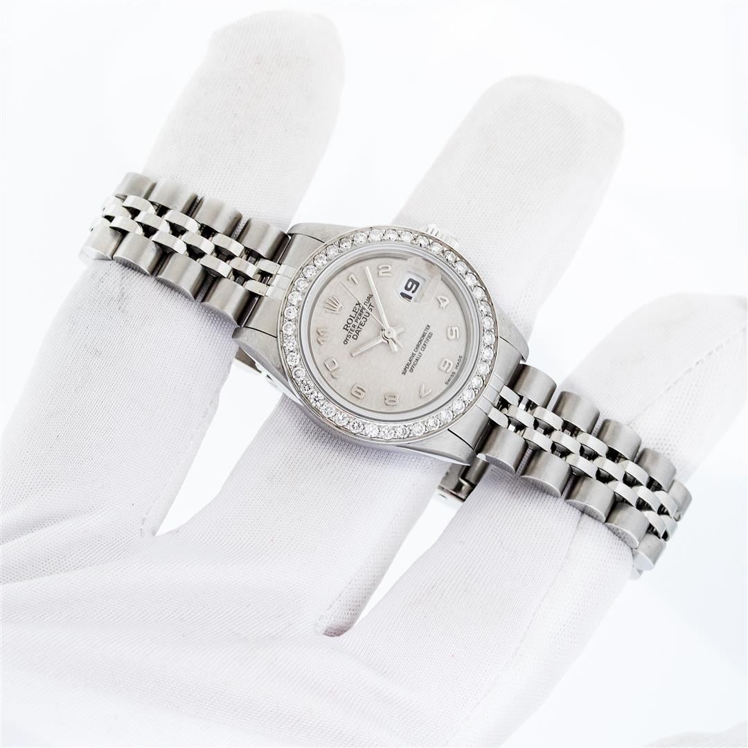 One Ladies Pre Owned Quickset Stainless Steel Rolex Datejust Polished Bright with Satin Finish, Serviced & Electronically Tested, Stainless Steel Case: 26mm, Rolex Stainless Steel Crown, Custom Bezel: New Stainless Steel Bead Set Diamond Bezel, Diamond Count: 40 Diamonds, Clarity: SI-VS, Color: G to H. Custom Crystal: New Sapphire With Magnified Date Window. Custom Hands: New Luminescent Hands. Rolex Movement: Automatic Winding Movement 2235. Rolex Dial: Cream Jubilee With Arabic Hour Markers. Date Window: 3 O'Clock Position Date Display, Model: Datejust. Condition: G-6 Extra Fine. Rolex Bracelet: Stainless Steel Jubilee Band. Bright Polish & Satin Finish. 6.0 Inch Length, Adjustable. Standard Clasp, With Rolex Logo. This Watch Has Been Serviced Time Tested And Is In Excellent Condition It Is Free Of All Scratches And Dents.