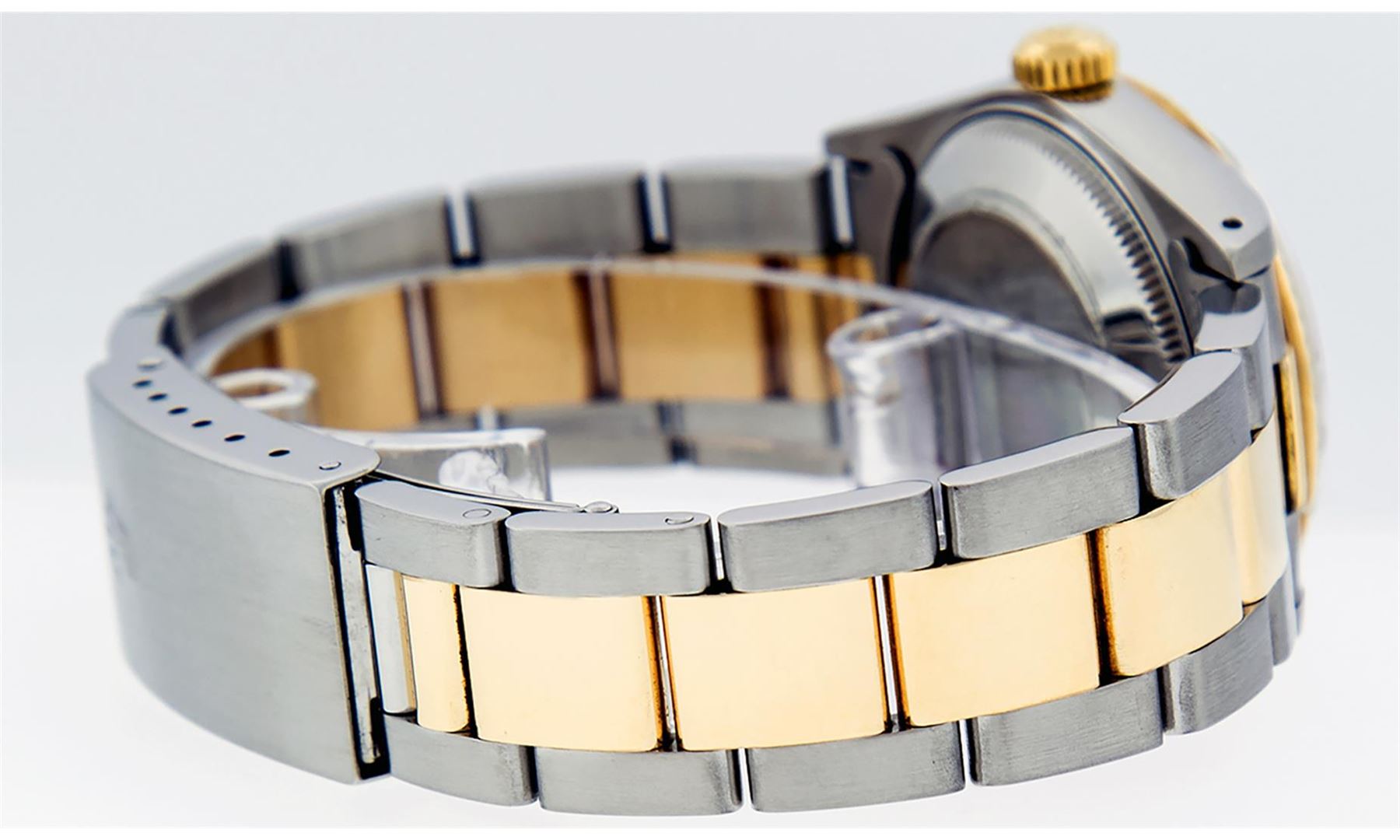 One Women's Rolex Midsize 18K Yellow Gold And Stainless Steel Datejust Polished, Serviced & Electronically Tested, Rolex Yellow Gold And Stainless Steel Case Case: 31mm, Rolex Stainless Steel Crown, Rolex Bezel: 18K Rolex Yellow Gold Fluted Bezel, Color: G To H, Clarity: VS2-SI1. Custom Crystal: New Sapphire With Magnified Date Window. Custom Hands: New Luminescent Hands. Rolex Movement: Automatic Winding Movement Caliber 2135. Rolex Dial: Silver Index Dial With Roman Track. Date Window: 3 O'Clock Position Date Display, Quickset, Model: Midsize Quickset Datejust. Condition: G-6 Extra Fine. Rolex Bracelet: 18K Yellow Gold And Stainless Steel Oyster Band. Bright Polish. 6.0 Inch Length, Adjustable. Standard Clasp, With Rolex Logo. This Pre Owned Watch Has Been Serviced Time Tested And Is In Excellent Condition It Is Free Of All Scratches And Dents.