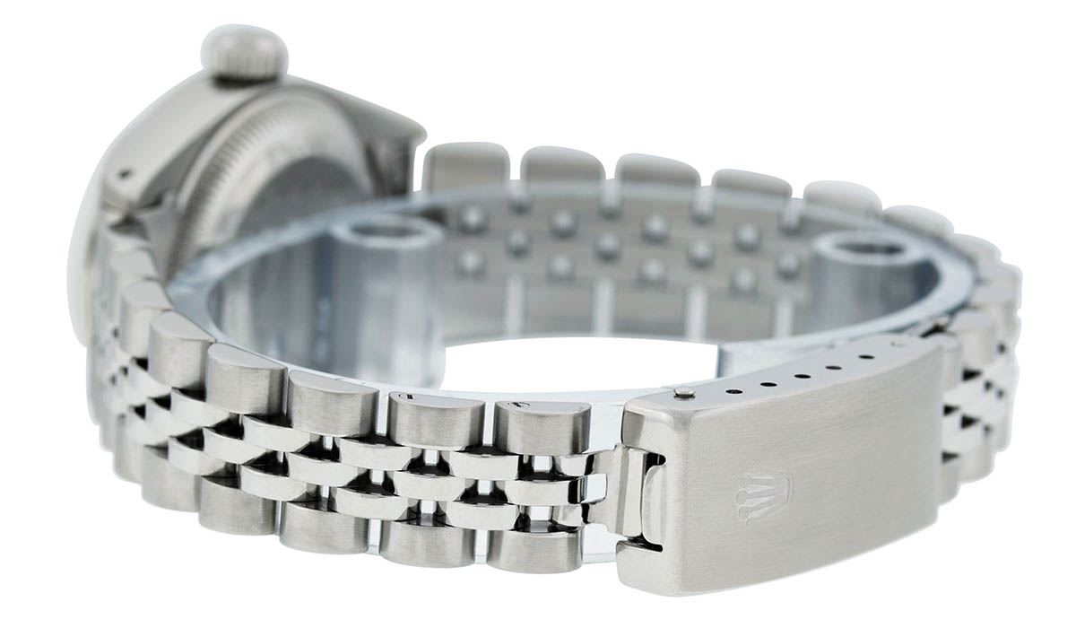 One Ladies Rolex Quickset Datejust Polished Bright with Satin Finish, Serviced & Electronically Tested, Stainless Steel Case:26mm, Stainless Steel Crown, Bezel: 18K White Gold Fluted Bezel. Custom Crystal: Acrylic Cyclops Lens. Movement: Automatic Winding Movement Caliber 2135. Dial: Silver Index Dial With Lumi Dot & Dash Track. Date Window: 3 O'Clock Position Date Display, Model: 69174 Quickset Datejust. Condition: G-6 Extra Fine. Bracelet: Stainless Steel Jubilee Band. Bright Polish & Satin Finish. 6.0 Inch Length, Adjustable. Standard Clasp, With Rolex Logo.