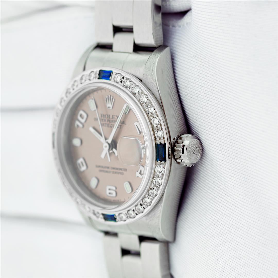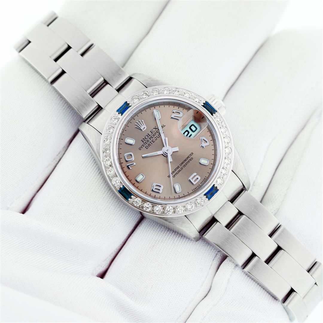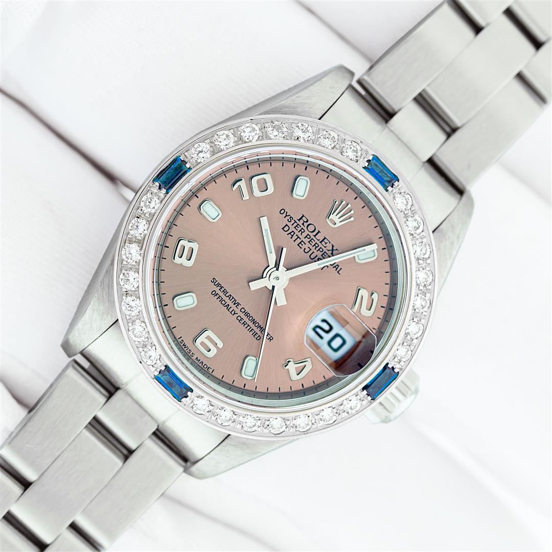 One Ladies Pre Owned Stainless Steel Rolex Datejust Polished Bright with Satin Finish, Serviced & Electronically Tested, Stainless Steel Case: 26mm, Rolex Stainless Steel Crown, Custom Bezel: New 18K White Gold Sapphire Bead Set Diamond Bezel, Diamond + Gem Count: 28 Diamonds + 4 Sapphires, Clarity: SI-VS, Color: G to H. Custom Crystal: New Sapphire With Magnified Date Window. Custom Hands: New Luminescent Hands. Rolex Movement: Automatic Winding Movement 2235. Rolex Dial: Salmon With Arabic Hour Markers & Dash Track. Date Window: 3 O'Clock Position Date Display, Model: Quickset Datejust. Condition: G-6 Extra Fine. Rolex Bracelet: Stainless Steel Oyster Band. Bright Polish & Satin Finish. 6.0 Inch Length, Adjustable. Standard Clasp, With Rolex Logo. This Watch Has Been Serviced Time Tested And Is In Excellent Condition It Is Free Of All Scratches And Dents.