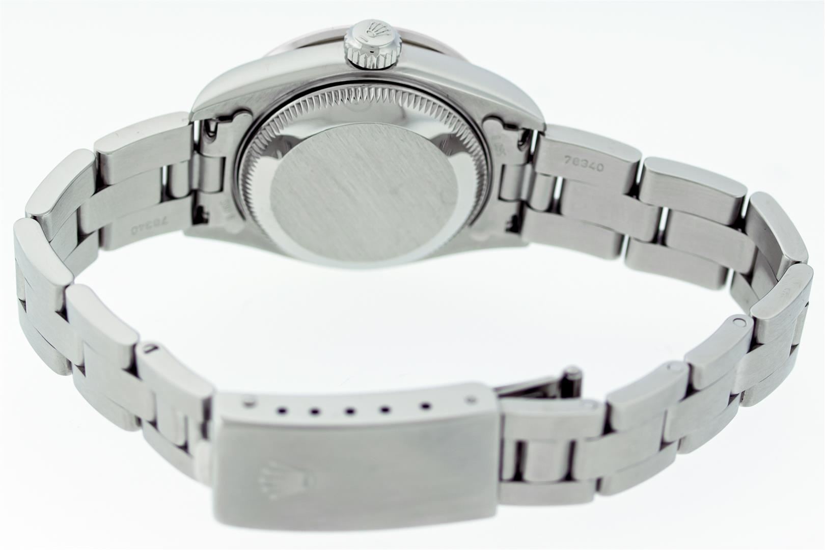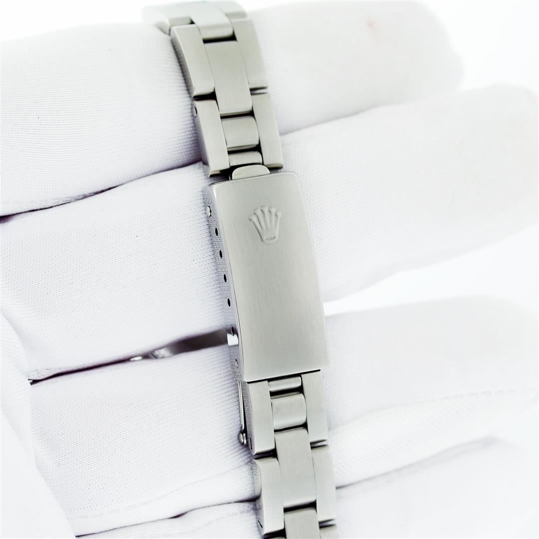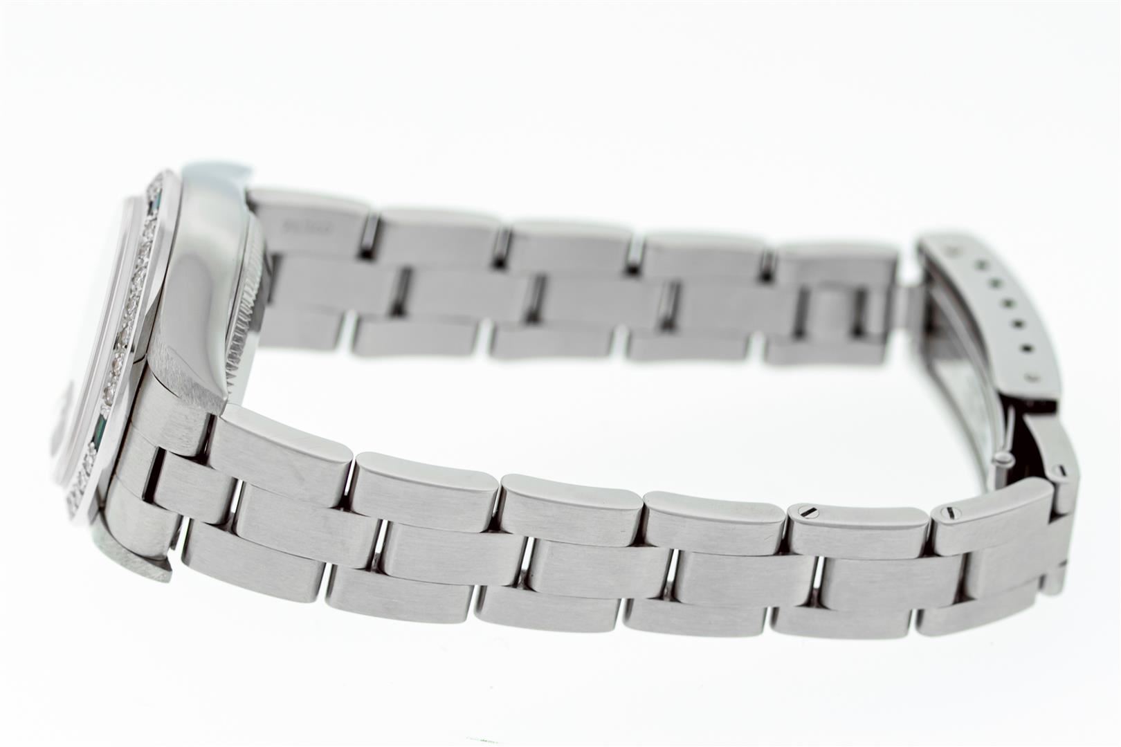 One Ladies Pre Owned Stainless Steel Rolex Datejust Polished Bright with Satin Finish, Serviced & Electronically Tested, Stainless Steel Case: 26mm, Rolex Stainless Steel Crown, Custom Bezel: New 18K White Gold Sapphire Bead Set Diamond Bezel, Diamond + Gem Count: 28 Diamonds + 4 Sapphires, Clarity: SI-VS, Color: G to H. Custom Crystal: New Sapphire With Magnified Date Window. Custom Hands: New Luminescent Hands. Rolex Movement: Automatic Winding Movement 2235. Rolex Dial: Salmon With Arabic Hour Markers & Dash Track. Date Window: 3 O'Clock Position Date Display, Model: Quickset Datejust. Condition: G-6 Extra Fine. Rolex Bracelet: Stainless Steel Oyster Band. Bright Polish & Satin Finish. 6.0 Inch Length, Adjustable. Standard Clasp, With Rolex Logo. This Watch Has Been Serviced Time Tested And Is In Excellent Condition It Is Free Of All Scratches And Dents.