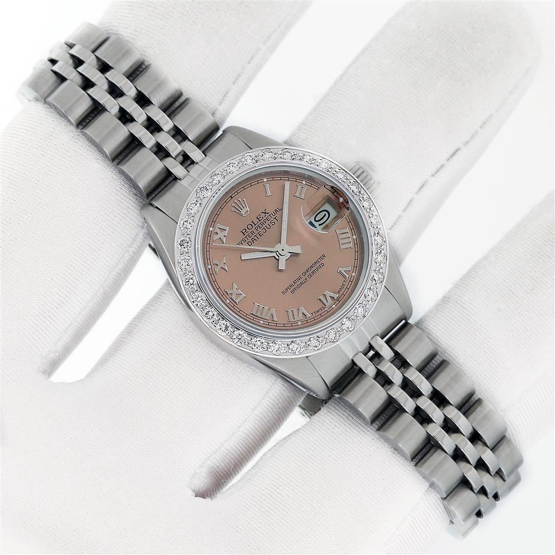 One Ladies Pre Owned Quickset Stainless Steel Rolex Datejust Polished Bright with Satin Finish Serviced & Electronically Tested, Rolex Stainless Steel Case: 26mm, Rolex Stainless Steel Crown, Custom Bezel: New 18K White Gold Beadset Diamond Bezel, Diamond Count: 32 Diamonds On Bezel Dial, Clarity: SI-VS, Color: G to H. Custom Crystal: New Sapphire With Magnified Date Window. Custom Hands: New Luminescent Hands. Rolex Movement: Automatic Winding Movement. Rolex Dial: Salmon Roman Dial With Square Track. Date Window: 3 O'Clock Position Date Display, Model: Datejust. Condition: G-6 Extra Fine. Rolex Bracelet: Stainless Steel Jubilee Band With Rolex Crown On Buckle. Bright Polish & Satin Finish. Band Length: 6.0 Inch Length, Adjustable. Standard Clasp, With Rolex Logo. This Watch Has Been Serviced Time Tested And Is In Excellent Condition It Is Free Of All Scratches And Dents. This Watch Comes With A Rolex Box.