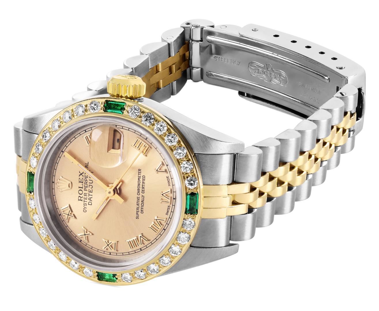 One Ladies Pre Owned Quickset Stainless Steel Rolex Datejust Polished Bright with Satin Finish, Serviced & Electronically Tested, Rolex Stainless Steel Case: 26mm, Rolex Yellow Gold Crown, Custom Bezel: New 18K Yellow Gold Diamond & Emerald Bezel, Stone Count: 28 Diamonds + 4 Emeralds On Bezel. Crystal: Sapphire With Magnified Date Window. Hands: Luminescent Hands. Rolex Movement: Automatic Winding Movement. Rolex Dial: Champagne with Roman Hour Markers and Square Track. Date Window: 3 O'Clock Position Date Display, Model: Quickset Datejust. Condition: G-6 Extra Fine. Rolex Bracelet: 18K Yellow Gold And Stainless Steel Jubilee Band. Bright Polish & Satin Finish. 6.0 Inch Length, Adjustable. Standard Clap, With Rolex Logo. This Watch Has Been Serviced Time Tested And Is In Excellent Condition It Is Free Of All Scratches And Dents.