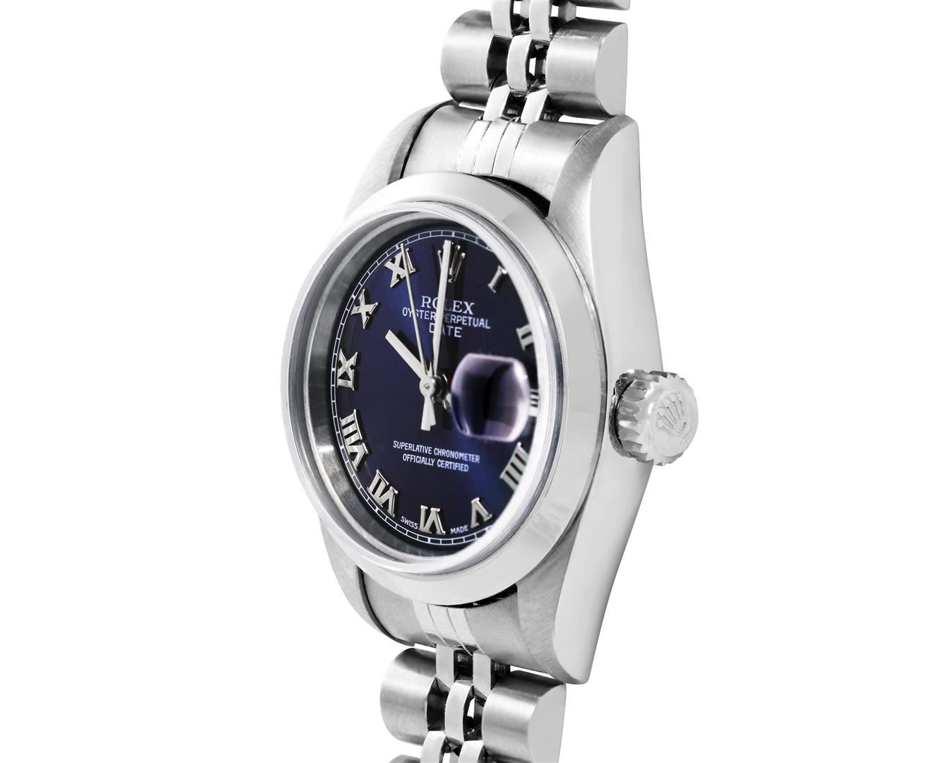 One Rolex Ladies Pre Owned Stainless Steel Date Wristwatch Polished Bright with Satin Finish, Serviced & Electronically Tested, Stainless Steel Case: 26mm, Stainless Steel Crown, Rolex Stainless Steel Smooth bezel. Crystal: Sapphire With Magnified Date Window. Custom Hands: New Solid Hands. Rolex Movement: 2235 Automatic Winding Movement. Rolex Dial: Factory Blue Dial With Roman Hour Markers, Square Track. Date Window: 3 O'Clock Position Date Display, Model: Quickset Sapphire Date. Condition: G-6 Extra Fine. Rolex Bracelet: Stainless Steel Jubilee Band. Bright Polish & Satin Finish. 6.0 Inch Length, Adjustable. Standard Clasp, With Rolex Logo. This Watch Has Been Serviced And Time Tested. It Is In Excellent Condition, Free Of All Scratches And Dents.