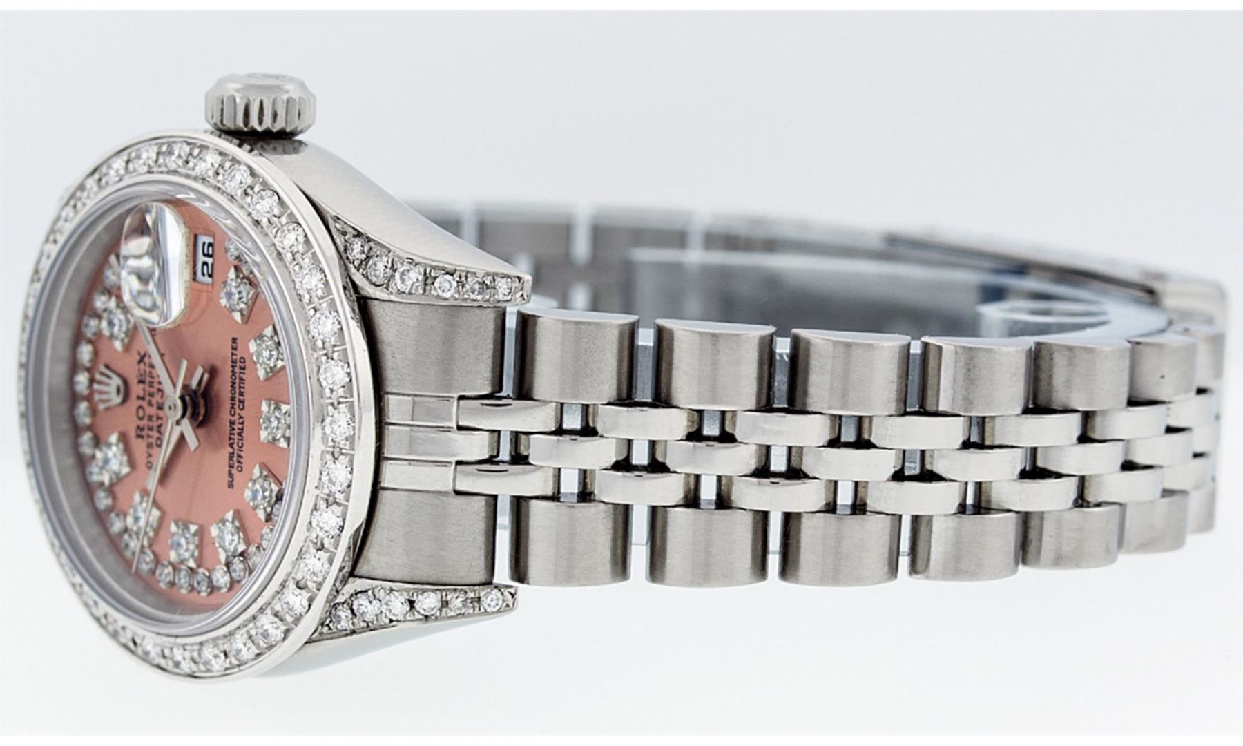 One Ladies Pre Owned Quickset Sapphire Stainless Steel Rolex Datejust Polished Bright with Satin Finish, Serviced And Electronically Tested, Stainless Steel Case: 26mm, Stainless Steel Crown, Custom Diamond Lugs: 24 Added Diamonds On Lugs. Custom Bezel: New 18K White Gold Beadset Diamond Bezel, Diamond Count: 32 Diamonds. Custom Crystal: New Sapphire With Date Window. Custom Hands: New Luminescent Hands. Rolex Movement: Automatic Quickset Winding Movement 2235. Custom Dial: Custom Salmon Dial With Added Diamonds, 43 Diamonds On Dial. Date Window: 3 O'Clock Position Date Display, Model: Quickset Datejust. Condition: G-6 Extra Fine. Rolex Bracelet: Stainless Steel Jubilee Band. Bright Polish And Satin Finish. 6.0 Inch Length, Adjustable. Standard Clasp, With Rolex Logo. This Watch Has Been Serviced Time Tested And Is In Excellent Condition It Is Free Of All Scratches And Dents.