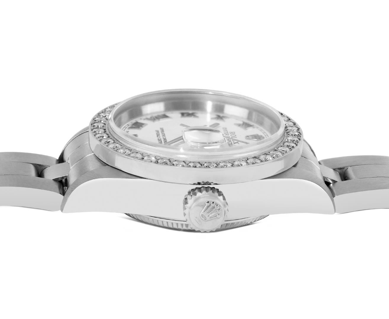 One Rolex Ladies Quickset Pre Owned Stainless Steel Date Wristwatch Polished Bright with Satin Finish, Serviced & Electronically Tested, Stainless Steel Case: 26mm, Stainless Steel Crown, Custom Bezel: New Stainless Steel Beadset Diamond Bezel, Diamond Count: 40 Diamonds On Bezel. Custom Crystal: New Sapphire With Magnified Date Window. Custom Hands: New Solid Hands. Rolex Movement: 2235 Automatic Winding Movement. Rolex Dial: Factory White With Roman Hour Markers, Square Track. Date Window: 3 O'Clock Position Date Display, Model: Quickset Sapphire Date. Condition: G-6 Extra Fine. Rolex Bracelet: Stainless Steel Jubilee Band. Bright Polish & Satin Finish. 6.0 Inch Length, Adjustable. Standard Clasp, With Rolex Logo. This Watch Has Been Serviced And Time Tested. It Is In Excellent Condition, Free Of All Scratches And Dents.