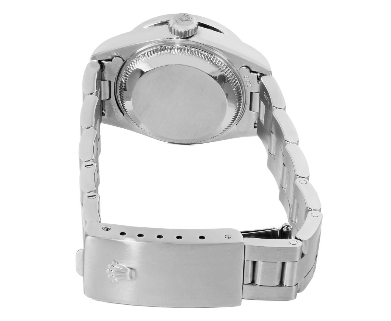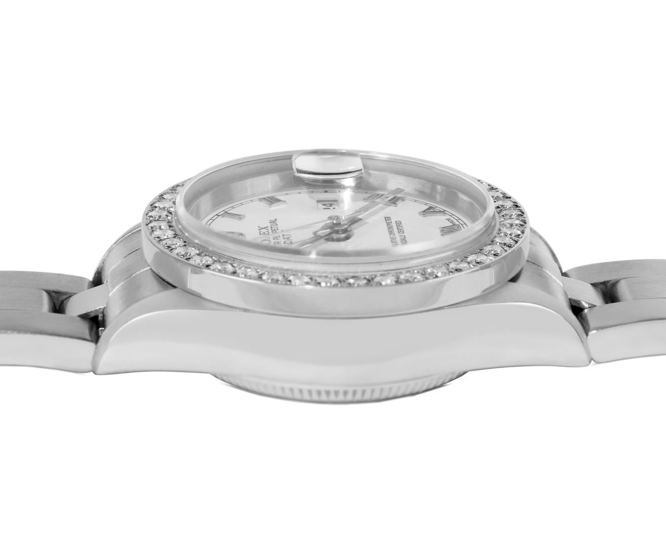 One Rolex Ladies Quickset Pre Owned Stainless Steel Date Wristwatch Polished Bright with Satin Finish, Serviced & Electronically Tested, Stainless Steel Case: 26mm, Stainless Steel Crown, Custom Bezel: New Stainless Steel Beadset Diamond Bezel, Diamond Count: 40 Diamonds On Bezel. Custom Crystal: New Sapphire With Magnified Date Window. Custom Hands: New Solid Hands. Rolex Movement: 2235 Automatic Winding Movement. Rolex Dial: Factory White With Roman Hour Markers, Square Track. Date Window: 3 O'Clock Position Date Display, Model: Quickset Sapphire Date. Condition: G-6 Extra Fine. Rolex Bracelet: Stainless Steel Jubilee Band. Bright Polish & Satin Finish. 6.0 Inch Length, Adjustable. Standard Clasp, With Rolex Logo. This Watch Has Been Serviced And Time Tested. It Is In Excellent Condition, Free Of All Scratches And Dents.