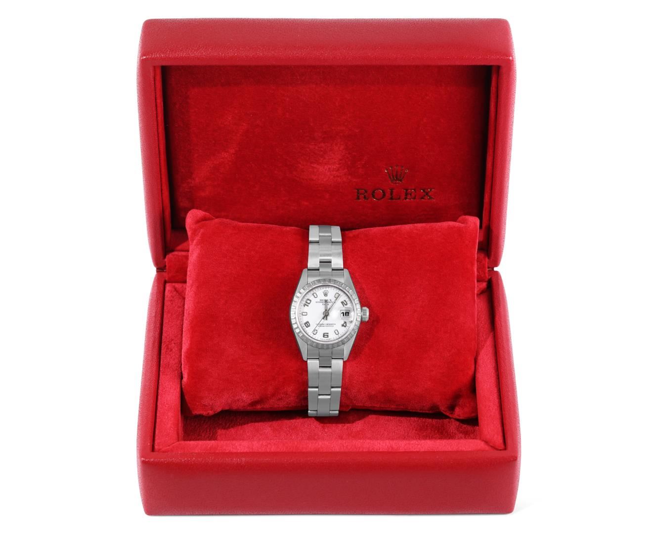 One Rolex Ladies Pre Owned Quickset Sapphire Stainless Steel Date Wristwatch Polished Bright with Satin Finish, Serviced & Electronically Tested, Stainless Steel Case: 26mm, Stainless Steel Crown, Rolex Stainless Steel Engine Turn bezel. Crystal: Sapphire With Magnified Date Window. Custom Hands: New Luminescent Hands. Rolex Movement: 2235 Automatic Winding Movement. Rolex Dial: Rolex White Arabic Dial with Arabic and Luminous Index Hour Markers With Dash Track. Date Window: 3 O'Clock Position Date Display, Model: Quickset Sapphire Date. Condition: G-6 Extra Fine. Rolex Bracelet: Stainless Steel Oyster Band. Bright Polish & Satin Finish. 6.0 Inch Length, Adjustable. Standard Clasp, With Rolex Logo. This Watch Has Been Serviced And Time Tested. It Is In Excellent Condition, Free Of All Scratches And Dents. This Watch Comes With A Rolex Box.