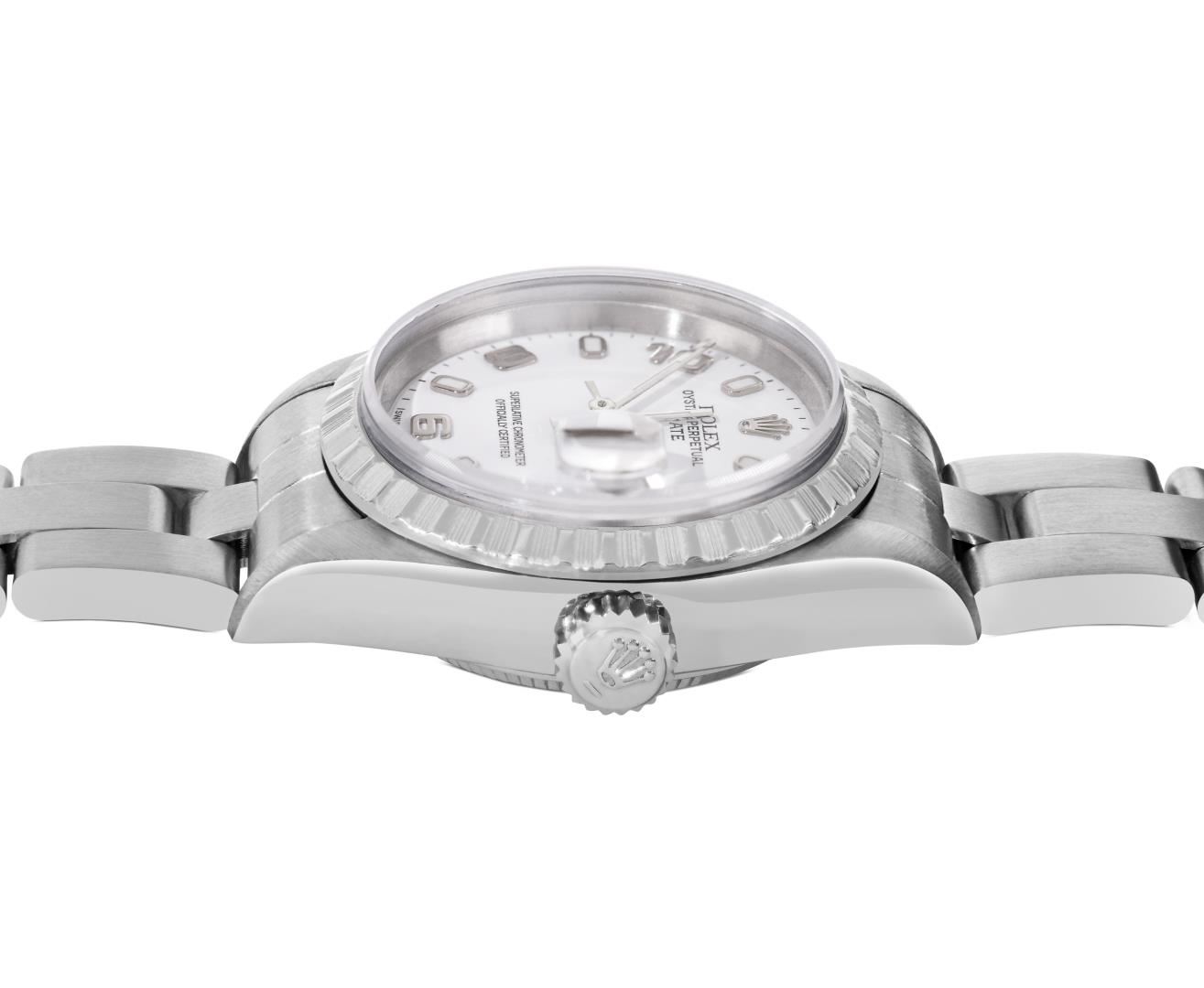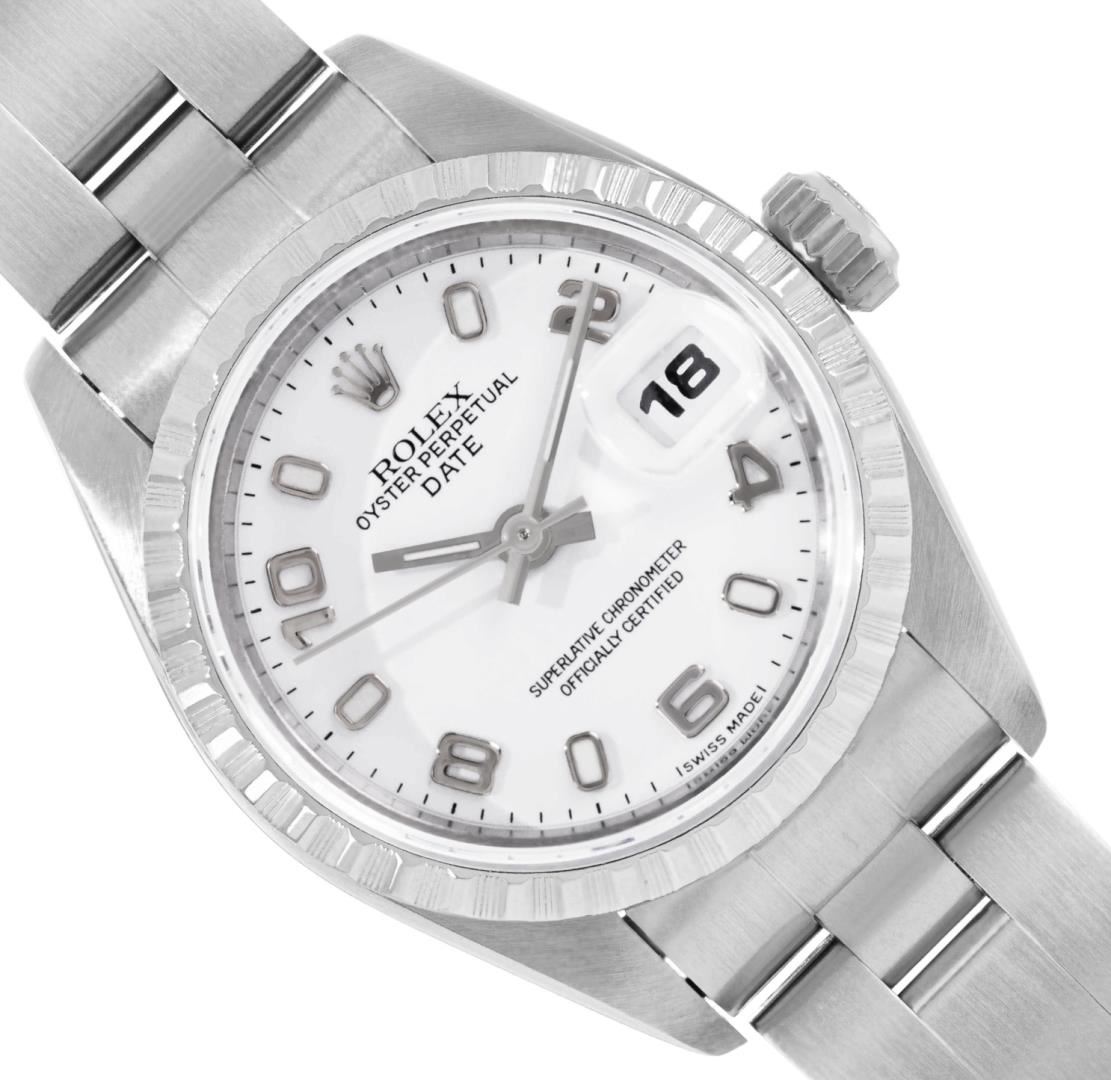 One Rolex Ladies Pre Owned Quickset Sapphire Stainless Steel Date Wristwatch Polished Bright with Satin Finish, Serviced & Electronically Tested, Stainless Steel Case: 26mm, Stainless Steel Crown, Rolex Stainless Steel Engine Turn bezel. Crystal: Sapphire With Magnified Date Window. Custom Hands: New Luminescent Hands. Rolex Movement: 2235 Automatic Winding Movement. Rolex Dial: Rolex White Arabic Dial with Arabic and Luminous Index Hour Markers With Dash Track. Date Window: 3 O'Clock Position Date Display, Model: Quickset Sapphire Date. Condition: G-6 Extra Fine. Rolex Bracelet: Stainless Steel Oyster Band. Bright Polish & Satin Finish. 6.0 Inch Length, Adjustable. Standard Clasp, With Rolex Logo. This Watch Has Been Serviced And Time Tested. It Is In Excellent Condition, Free Of All Scratches And Dents. This Watch Comes With A Rolex Box.