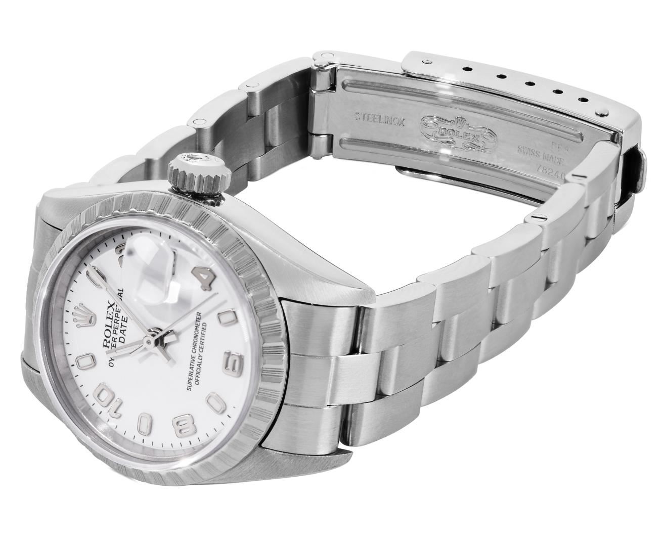 One Rolex Ladies Pre Owned Quickset Sapphire Stainless Steel Date Wristwatch Polished Bright with Satin Finish, Serviced & Electronically Tested, Stainless Steel Case: 26mm, Stainless Steel Crown, Rolex Stainless Steel Engine Turn bezel. Crystal: Sapphire With Magnified Date Window. Custom Hands: New Luminescent Hands. Rolex Movement: 2235 Automatic Winding Movement. Rolex Dial: Rolex White Arabic Dial with Arabic and Luminous Index Hour Markers With Dash Track. Date Window: 3 O'Clock Position Date Display, Model: Quickset Sapphire Date. Condition: G-6 Extra Fine. Rolex Bracelet: Stainless Steel Oyster Band. Bright Polish & Satin Finish. 6.0 Inch Length, Adjustable. Standard Clasp, With Rolex Logo. This Watch Has Been Serviced And Time Tested. It Is In Excellent Condition, Free Of All Scratches And Dents. This Watch Comes With A Rolex Box.