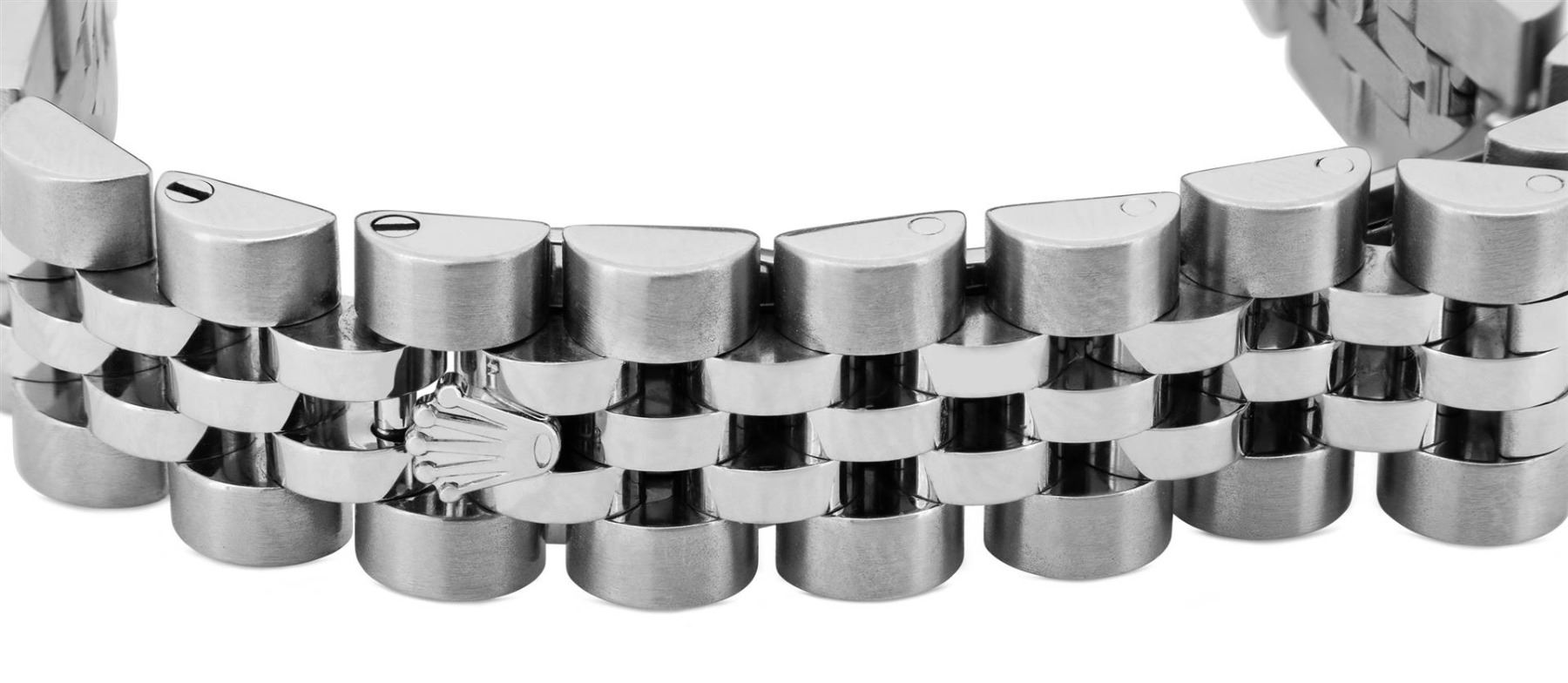 One Rolex Ladies Pre Owned Stainless Steel Datejust Wristwatch Polished Bright with Satin Finish, Serviced & Electronically Tested, Stainless Steel Case: 26mm, Stainless Steel Crown, Custom Bezel: New 18K White Gold Emerald Beadset Diamond Bezel, Diamond + Gem Count: 36 Diamonds + 4 Emeralds, Clarity: SI-VS, Color: G to H. Crystal: Sapphire With Magnified Date Window. Hands: Luminescent Hands. Rolex Movement: 2235 Automatic Winding Movement. Rolex Dial: Factory Silver Dial With Index Hour Markers And Dash Tracks. Date Window: 3 O'Clock Position Date Display, Model: Datejust. Condition: G-6 Extra Fine. Rolex Bracelet: Stainless Steel Jubilee Band With Hidden Clasp. Bright Polish & Satin Finish. 6.0 Inch Length, Adjustable. Hidden Clasp, With Rolex Logo. This Watch Has Been Serviced And Time Tested. It Is In Excellent Condition, Free Of All Scratches And Dents.