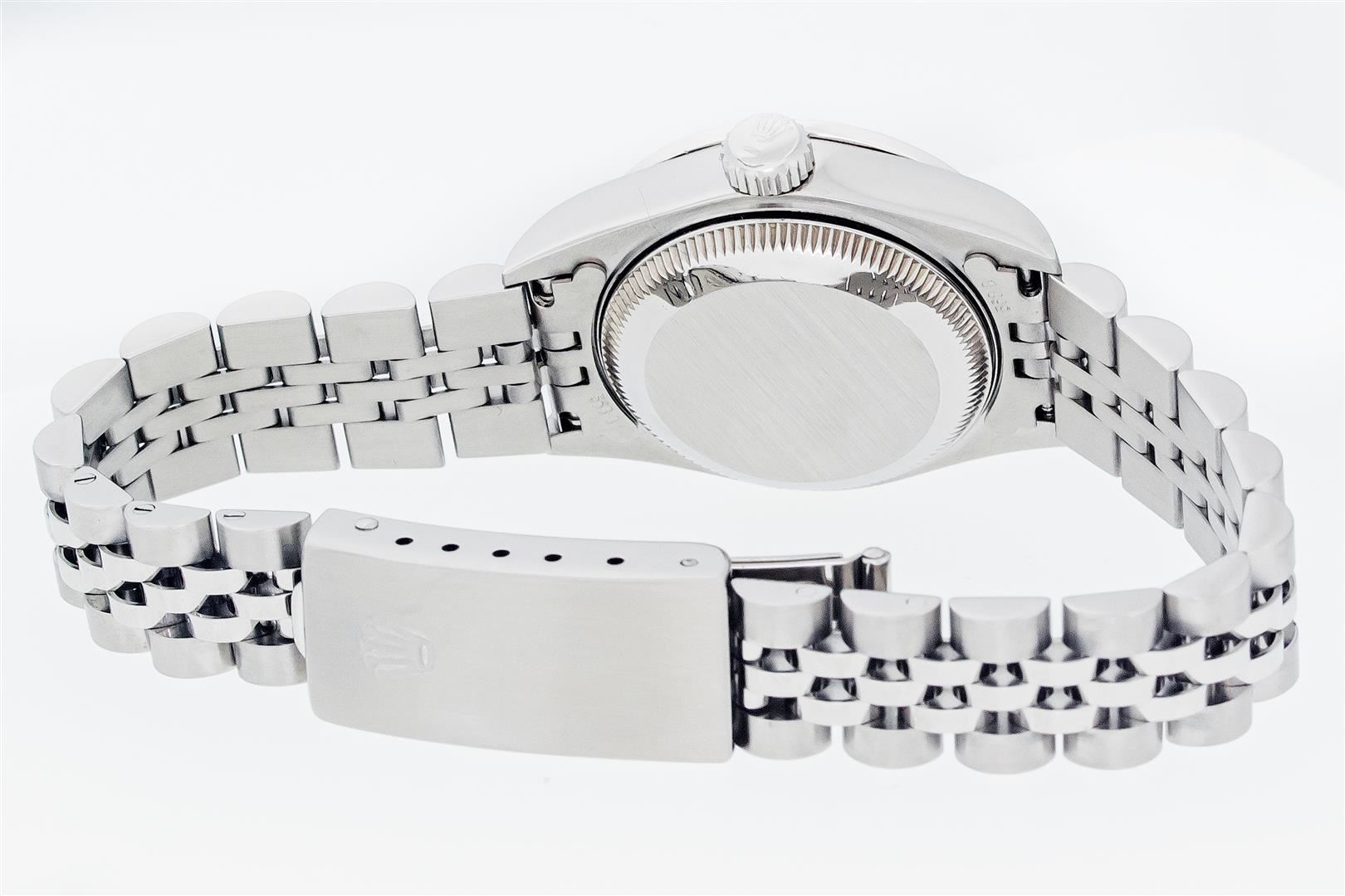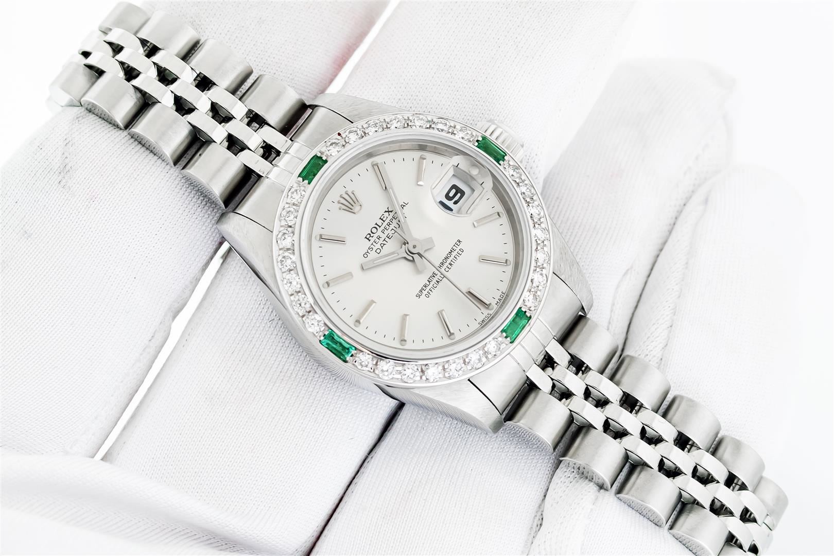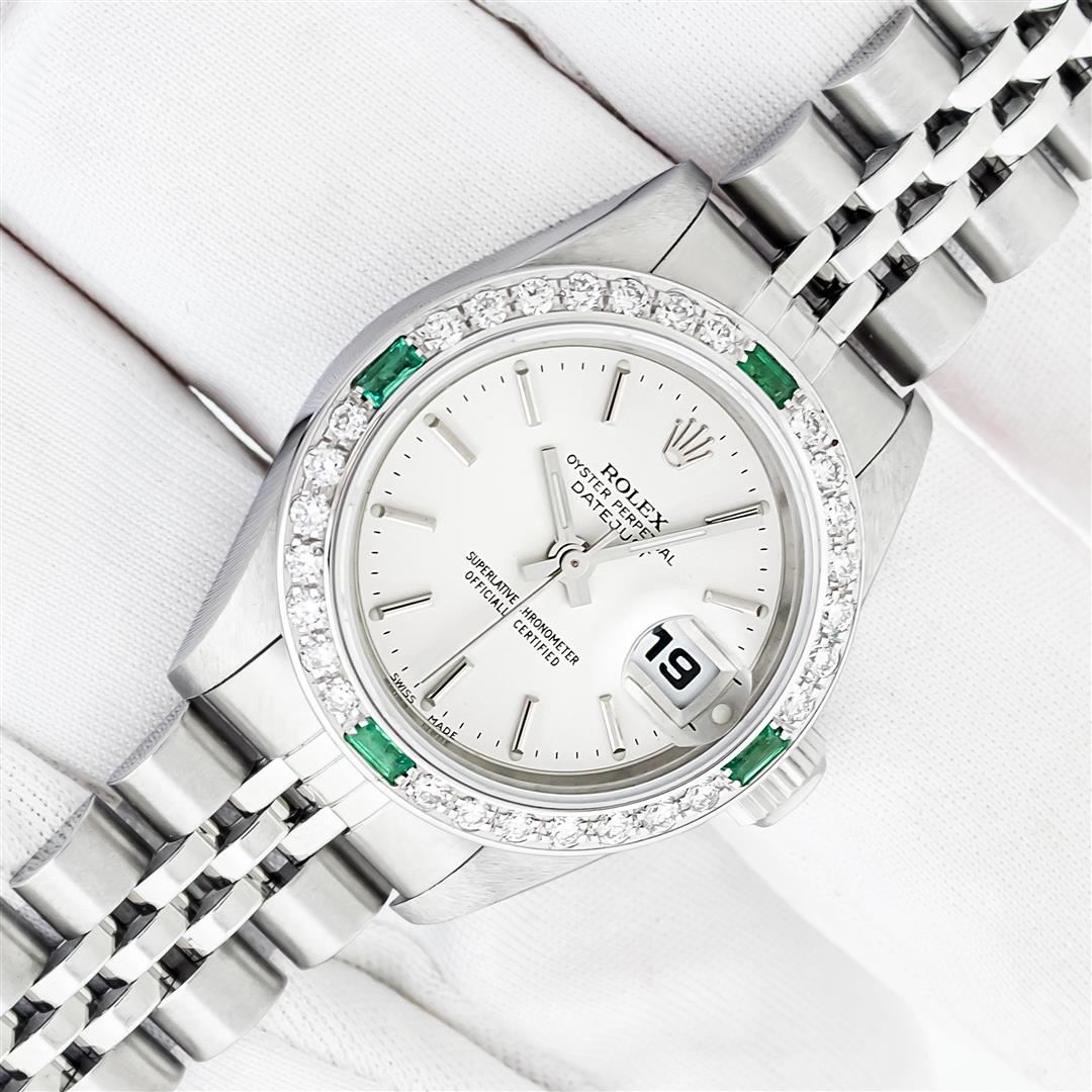One Ladies Pre Owned Quickset Stainless Steel Rolex Datejust Polished Bright with Satin Finish, Serviced & Electronically Tested, Stainless Steel Case: 26mm, Rolex Stainless Steel Crown, Custom Bezel: New 18K White Gold Emerald Bead Set Diamond Bezel, Diamond + Gem Count: 28 Diamonds + 4 Emeralds, Clarity: SI-VS, Color: G to H. Custom Crystal: New Sapphire With Magnified Date Window. Custom Hands: New Luminescent Hands. Rolex Movement: Automatic Winding Movement 2235. Rolex Dial: Silver With Index Hour Markers With Dash Track & Lumi Dot. Date Window: 3 O'Clock Position Date Display, Model: Quickset Datejust. Condition: G-6 Extra Fine. Rolex Bracelet: Stainless Steel Jubilee Band. Bright Polish & Satin Finish. 6.0 Inch Length, Adjustable. Standard Clasp, With Rolex Logo. This Watch Has Been Serviced Time Tested And Is In Excellent Condition It Is Free Of All Scratches And Dents.