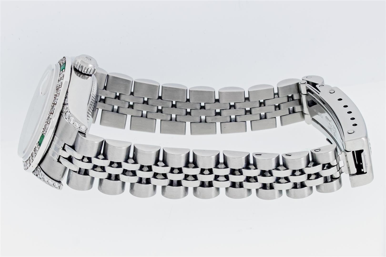 One Ladies Pre Owned Quickset Stainless Steel Rolex Datejust Polished Bright with Satin Finish, Serviced & Electronically Tested, Stainless Steel Case: 26mm, Custom Diamond Lugs: Added Diamonds On Lugs, Diamond Count: 24 Diamonds On Bezel, Color: G To H, Clartity: SI-VS. Rolex Stainless Steel Crown, Custom Bezel: New 18K White Gold Emerald Bead Set Diamond Bezel, Diamond + Gem Count: 28 Diamonds + 4 Emeralds, Clarity: SI-VS, Color: G to H. Custom Crystal: New Sapphire With Magnified Date Window. Custom Hands: New Luminescent Hands. Rolex Movement: Automatic Winding Movement 2235. Rolex Dial: Silver With Index Hour Markers With Dash Track & Lumi Dot. Date Window: 3 O'Clock Position Date Display, Model: Quickset Datejust. Condition: G-6 Extra Fine. Rolex Bracelet: Stainless Steel Jubilee Band. Bright Polish & Satin Finish. 6.0 Inch Length, Adjustable. Standard Clasp, With Rolex Logo. This Watch Has Been Serviced Time Tested And Is In Excellent Condition It Is Free Of All Scratches And Dents.