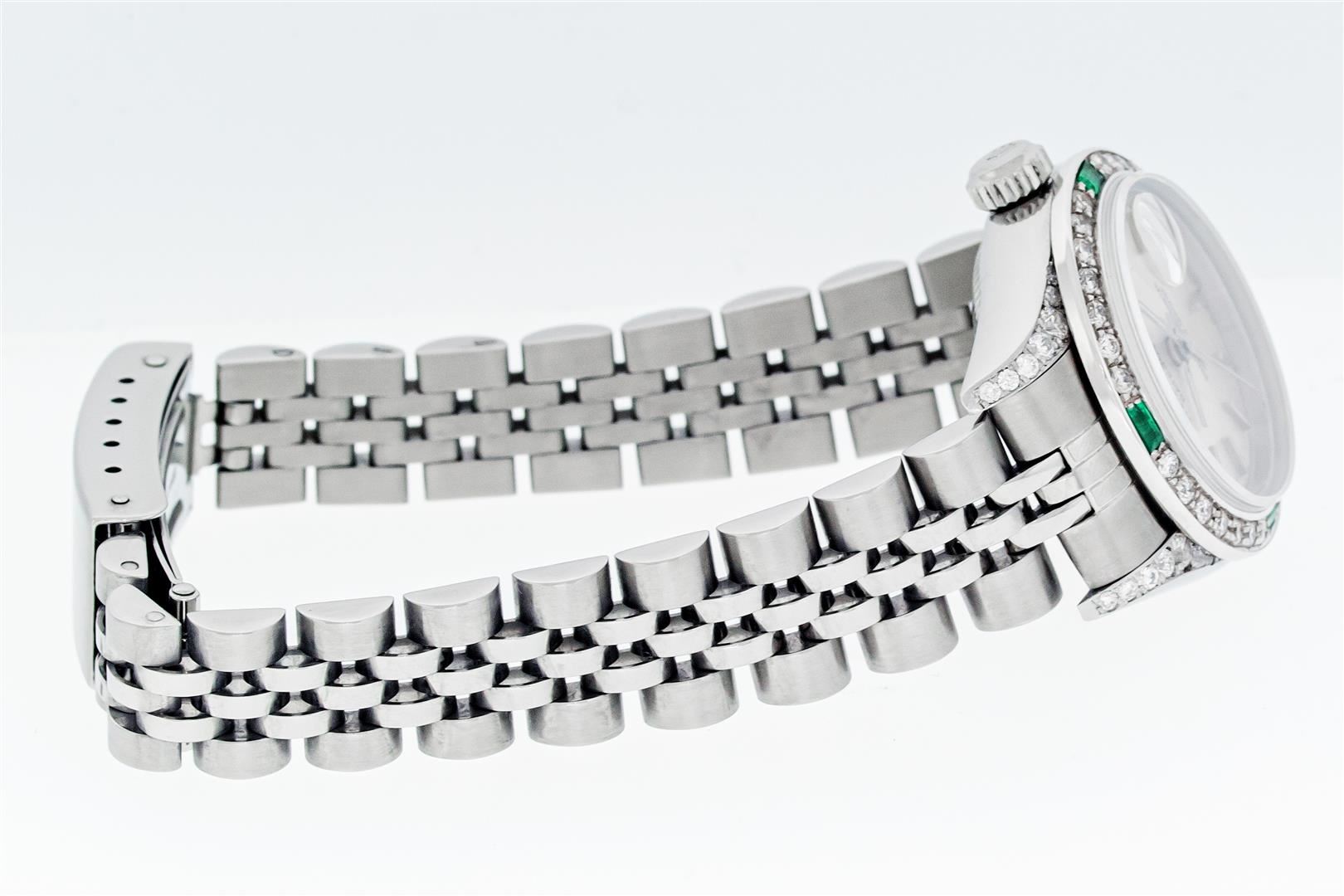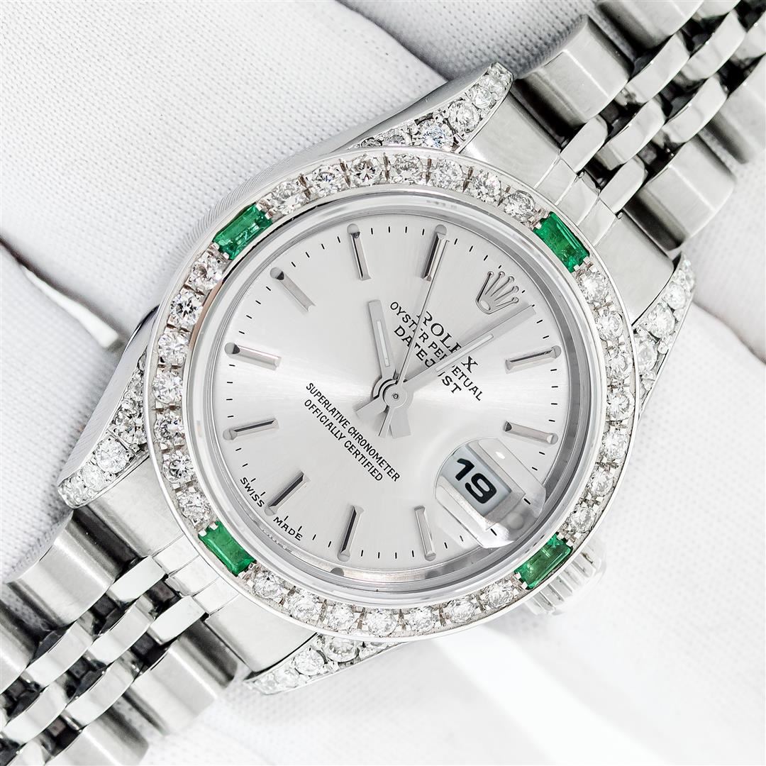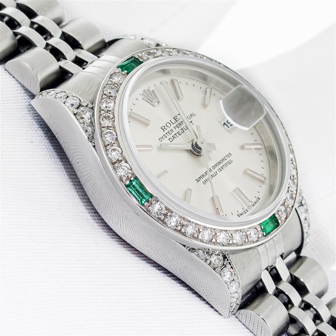 One Ladies Pre Owned Quickset Stainless Steel Rolex Datejust Polished Bright with Satin Finish, Serviced & Electronically Tested, Stainless Steel Case: 26mm, Custom Diamond Lugs: Added Diamonds On Lugs, Diamond Count: 24 Diamonds On Bezel, Color: G To H, Clartity: SI-VS. Rolex Stainless Steel Crown, Custom Bezel: New 18K White Gold Emerald Bead Set Diamond Bezel, Diamond + Gem Count: 28 Diamonds + 4 Emeralds, Clarity: SI-VS, Color: G to H. Custom Crystal: New Sapphire With Magnified Date Window. Custom Hands: New Luminescent Hands. Rolex Movement: Automatic Winding Movement 2235. Rolex Dial: Silver With Index Hour Markers With Dash Track & Lumi Dot. Date Window: 3 O'Clock Position Date Display, Model: Quickset Datejust. Condition: G-6 Extra Fine. Rolex Bracelet: Stainless Steel Jubilee Band. Bright Polish & Satin Finish. 6.0 Inch Length, Adjustable. Standard Clasp, With Rolex Logo. This Watch Has Been Serviced Time Tested And Is In Excellent Condition It Is Free Of All Scratches And Dents.
