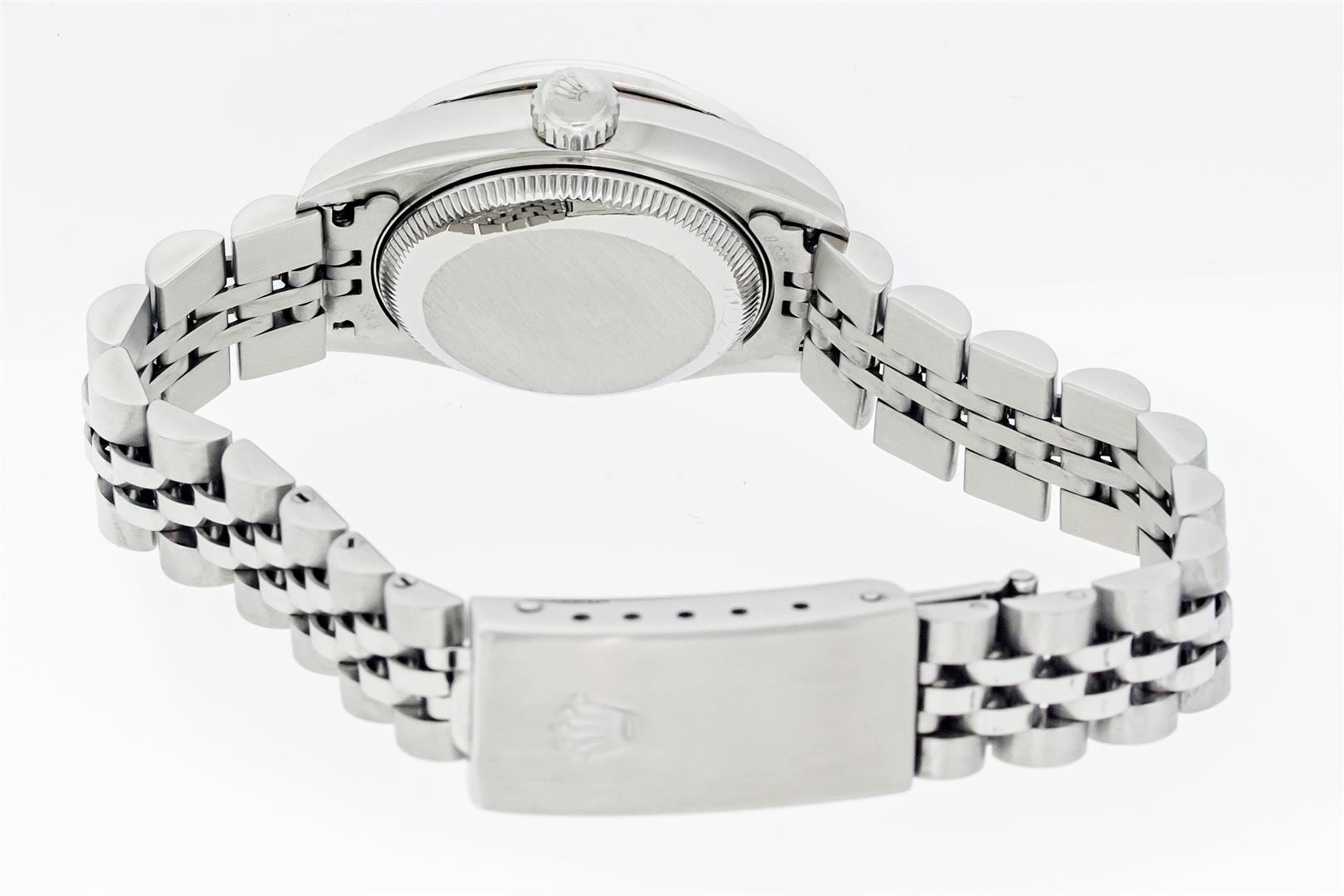 One Ladies Pre Owned Quickset Stainless Steel Rolex Datejust Polished Bright with Satin Finish, Serviced & Electronically Tested, Stainless Steel Case: 26mm, Custom Diamond Lugs: Added Diamonds On Lugs, Diamond Count: 24 Diamonds On Bezel, Color: G To H, Clartity: SI-VS. Rolex Stainless Steel Crown, Custom Bezel: New 18K White Gold Ruby Bead Set Diamond Bezel, Diamond + Gem Count: 28 Diamonds + 4 Rubies, Clarity: SI-VS, Color: G to H. Custom Crystal: New Sapphire With Magnified Date Window. Custom Hands: New Luminescent Hands. Rolex Movement: Automatic Winding Movement 2235. Rolex Dial: Silver With Index Hour Markers With Dash Track & Lumi Dot. Date Window: 3 O'Clock Position Date Display, Model: Quickset Datejust. Condition: G-6 Extra Fine. Rolex Bracelet: Stainless Steel Jubilee Band. Bright Polish & Satin Finish. 6.0 Inch Length, Adjustable. Standard Clasp, With Rolex Logo. This Watch Has Been Serviced Time Tested And Is In Excellent Condition It Is Free Of All Scratches And Dents.