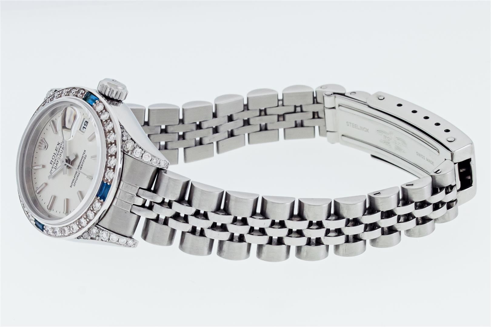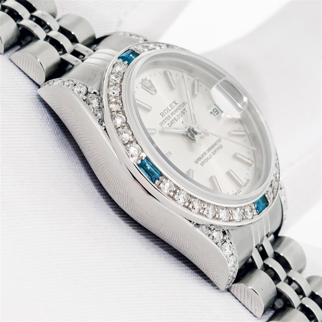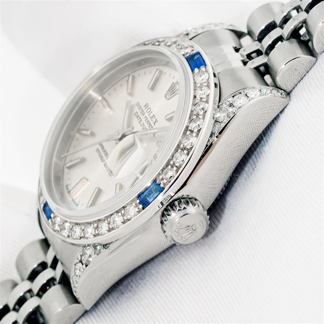 One Ladies Pre Owned Quickset Stainless Steel Rolex Datejust Polished Bright with Satin Finish, Serviced & Electronically Tested, Stainless Steel Case: 26mm, Custom Diamond Lugs: Added Diamonds On Lugs, Diamond Count: 24 Diamonds On Bezel, Color: G To H, Clartity: SI-VS. Rolex Stainless Steel Crown, Custom Bezel: New 18K White Gold Sapphire Bead Set Diamond Bezel, Diamond + Gem Count: 28 Diamonds + 4 Sapphires, Clarity: SI-VS, Color: G to H. Custom Crystal: New Sapphire With Magnified Date Window. Custom Hands: New Luminescent Hands. Rolex Movement: Automatic Winding Movement 2235. Rolex Dial: Silver With Index Hour Markers With Dash Track & Lumi Dot. Date Window: 3 O'Clock Position Date Display, Model: Quickset Datejust. Condition: G-6 Extra Fine. Rolex Bracelet: Stainless Steel Jubilee Band. Bright Polish & Satin Finish. 6.0 Inch Length, Adjustable. Standard Clasp, With Rolex Logo. This Watch Has Been Serviced Time Tested And Is In Excellent Condition It Is Free Of All Scratches And Dents.