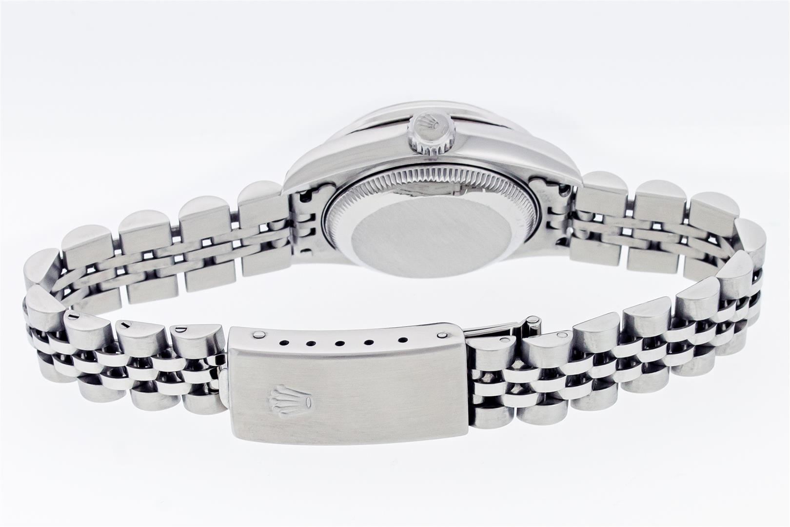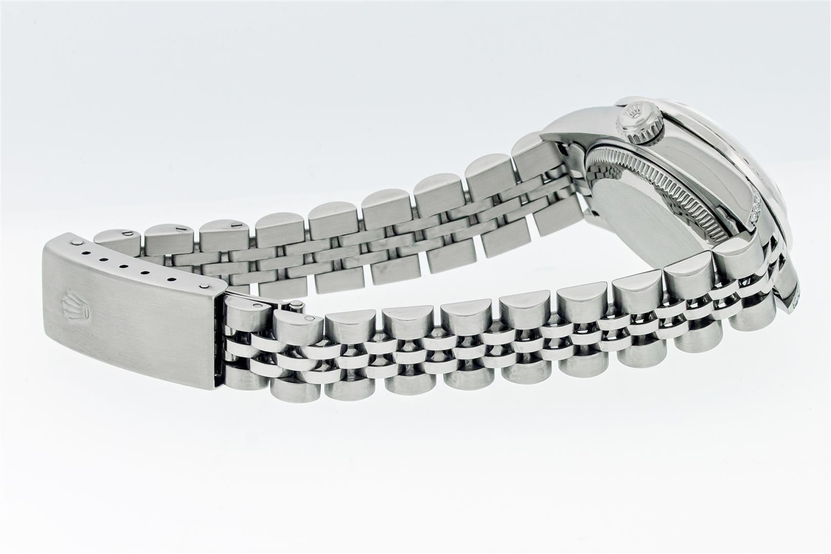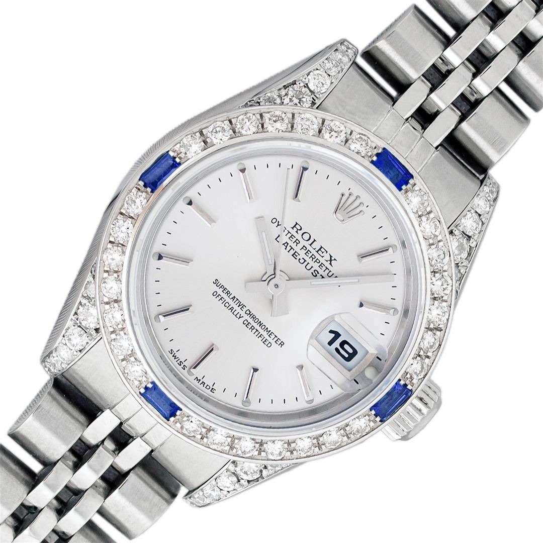 One Ladies Pre Owned Quickset Stainless Steel Rolex Datejust Polished Bright with Satin Finish, Serviced & Electronically Tested, Stainless Steel Case: 26mm, Custom Diamond Lugs: Added Diamonds On Lugs, Diamond Count: 24 Diamonds On Bezel, Color: G To H, Clartity: SI-VS. Rolex Stainless Steel Crown, Custom Bezel: New 18K White Gold Sapphire Bead Set Diamond Bezel, Diamond + Gem Count: 28 Diamonds + 4 Sapphires, Clarity: SI-VS, Color: G to H. Custom Crystal: New Sapphire With Magnified Date Window. Custom Hands: New Luminescent Hands. Rolex Movement: Automatic Winding Movement 2235. Rolex Dial: Silver With Index Hour Markers With Dash Track & Lumi Dot. Date Window: 3 O'Clock Position Date Display, Model: Quickset Datejust. Condition: G-6 Extra Fine. Rolex Bracelet: Stainless Steel Jubilee Band. Bright Polish & Satin Finish. 6.0 Inch Length, Adjustable. Standard Clasp, With Rolex Logo. This Watch Has Been Serviced Time Tested And Is In Excellent Condition It Is Free Of All Scratches And Dents.