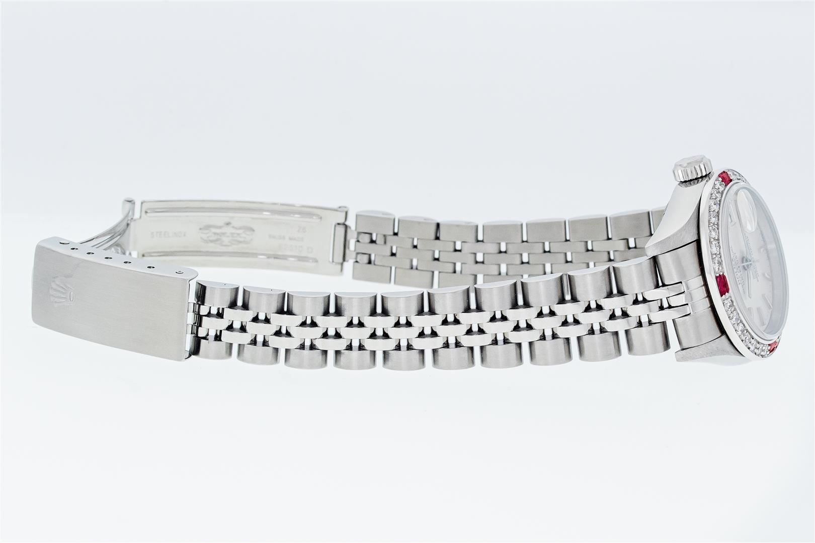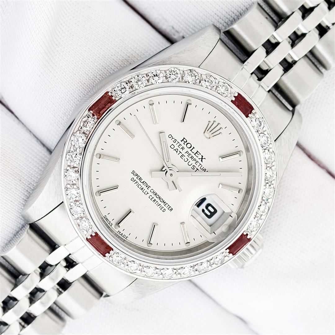 One Ladies Pre Owned Quickset Stainless Steel Rolex Datejust Polished Bright with Satin Finish, Serviced & Electronically Tested, Stainless Steel Case: 26mm, Rolex Stainless Steel Crown, Custom Bezel: New 18K White Gold Ruby Bead Set Diamond Bezel, Diamond + Gem Count: 28 Diamonds + 4 Rubies, Clarity: SI-VS, Color: G to H. Custom Crystal: New Sapphire With Magnified Date Window. Custom Hands: New Luminescent Hands. Rolex Movement: Automatic Winding Movement 2235. Rolex Dial: Silver With Index Hour Markers With Dash Track & Lumi Dot. Date Window: 3 O'Clock Position Date Display, Model: Quickset Datejust. Condition: G-6 Extra Fine. Rolex Bracelet: Stainless Steel Jubilee Band. Bright Polish & Satin Finish. 6.0 Inch Length, Adjustable. Standard Clasp, With Rolex Logo. This Watch Has Been Serviced Time Tested And Is In Excellent Condition It Is Free Of All Scratches And Dents.