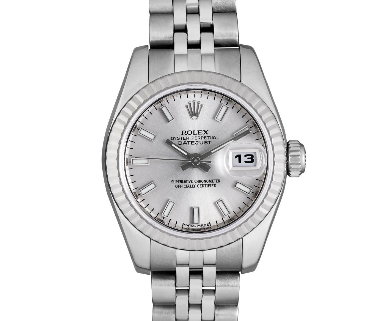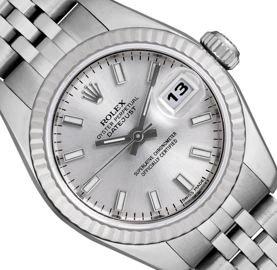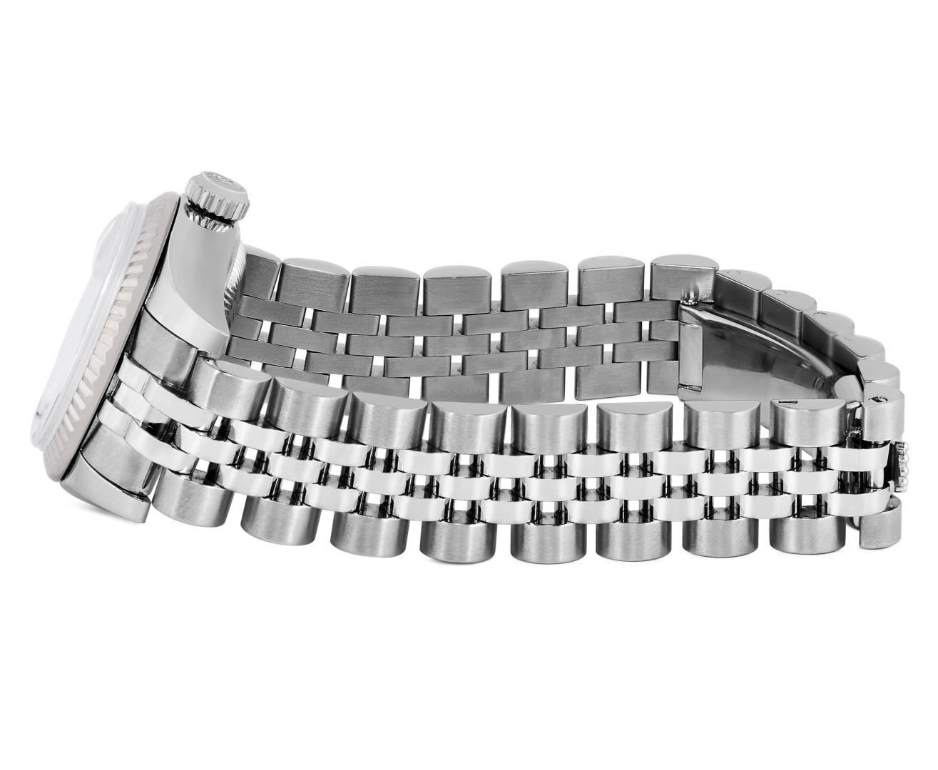 One Ladies Pre Owned Rolex Stainless Steel Datejust Wristwatch Polished Bright with Satin Finish, Serviced & Electronically Tested, Stainless Steel Case: 26mm, Stainless Steel Crown, Rolex Bezel: Rolex 18K White Gold Fluted bezel. Crystal: Sapphire With Magnified Date Window. Hands: Luminescent Hands. Rolex Movement: 2235 Automatic Winding Movement. Rolex Dial: Factory Silver With Index Hour Markers And Dash Tracks. Date Window: 3 O'Clock Position Date Display, Model: Quickset Datejust. Condition: G-6 Extra Fine. Rolex Bracelet: Stainless Steel Jubilee Band. Bright Polish & Satin Finish. 6.0 Inch Length, Adjustable. Hidden Clasp, With Rolex Logo. This Watch Has Been Serviced And Time Tested. It Is In Excellent Condition, Free Of All Scratches And Dents. This Watch Comes With A Rolex Box.