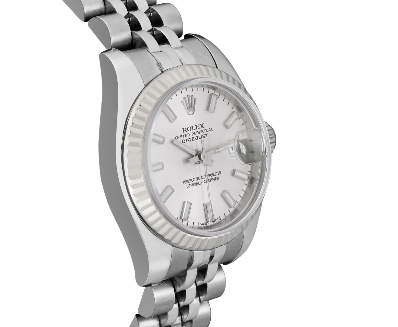 One Ladies Pre Owned Rolex Stainless Steel Datejust Wristwatch Polished Bright with Satin Finish, Serviced & Electronically Tested, Stainless Steel Case: 26mm, Stainless Steel Crown, Rolex Bezel: Rolex 18K White Gold Fluted bezel. Crystal: Sapphire With Magnified Date Window. Hands: Luminescent Hands. Rolex Movement: 2235 Automatic Winding Movement. Rolex Dial: Factory Silver With Index Hour Markers And Dash Tracks. Date Window: 3 O'Clock Position Date Display, Model: Quickset Datejust. Condition: G-6 Extra Fine. Rolex Bracelet: Stainless Steel Jubilee Band. Bright Polish & Satin Finish. 6.0 Inch Length, Adjustable. Hidden Clasp, With Rolex Logo. This Watch Has Been Serviced And Time Tested. It Is In Excellent Condition, Free Of All Scratches And Dents. This Watch Comes With A Rolex Box.