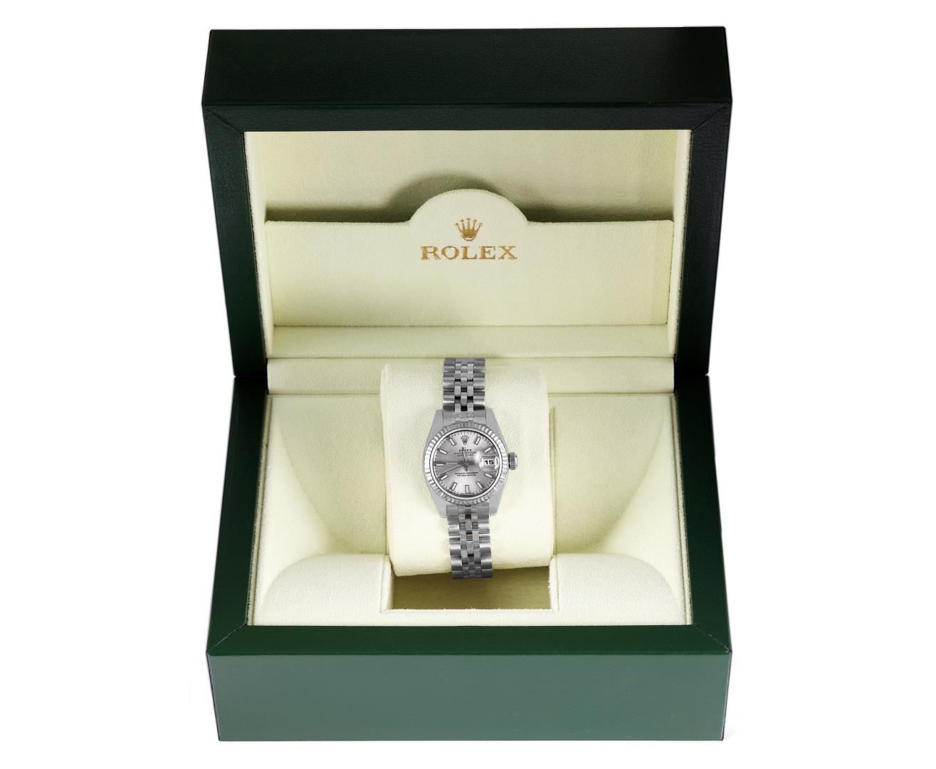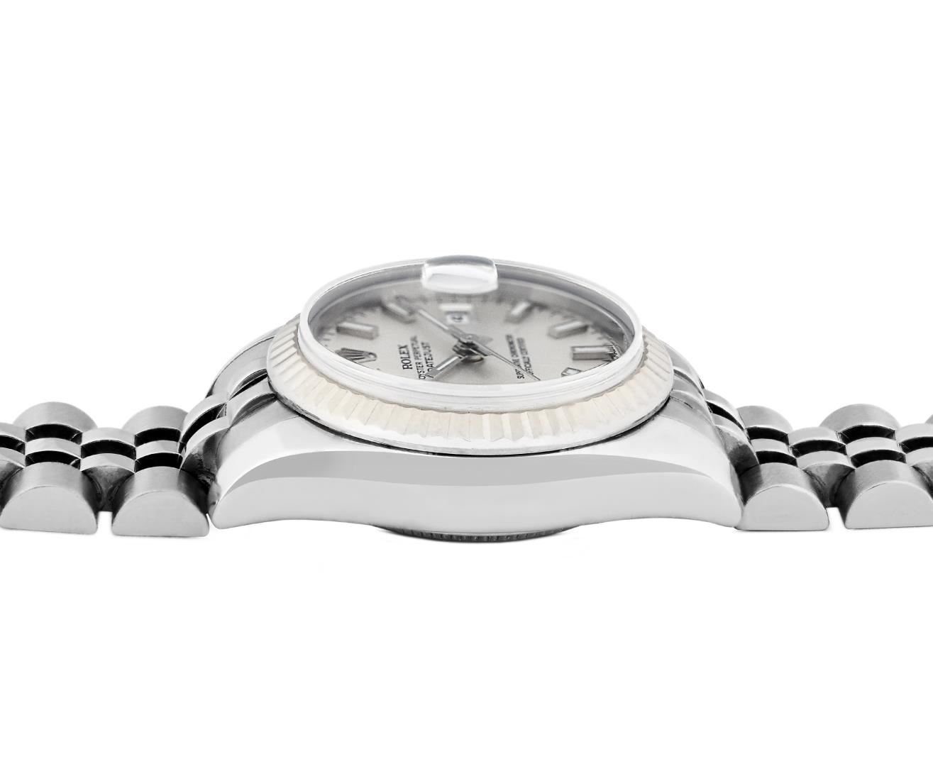 One Ladies Pre Owned Rolex Stainless Steel Datejust Wristwatch Polished Bright with Satin Finish, Serviced & Electronically Tested, Stainless Steel Case: 26mm, Stainless Steel Crown, Rolex Bezel: Rolex 18K White Gold Fluted bezel. Crystal: Sapphire With Magnified Date Window. Hands: Luminescent Hands. Rolex Movement: 2235 Automatic Winding Movement. Rolex Dial: Factory Silver With Index Hour Markers And Dash Tracks. Date Window: 3 O'Clock Position Date Display, Model: Quickset Datejust. Condition: G-6 Extra Fine. Rolex Bracelet: Stainless Steel Jubilee Band. Bright Polish & Satin Finish. 6.0 Inch Length, Adjustable. Hidden Clasp, With Rolex Logo. This Watch Has Been Serviced And Time Tested. It Is In Excellent Condition, Free Of All Scratches And Dents. This Watch Comes With A Rolex Box.