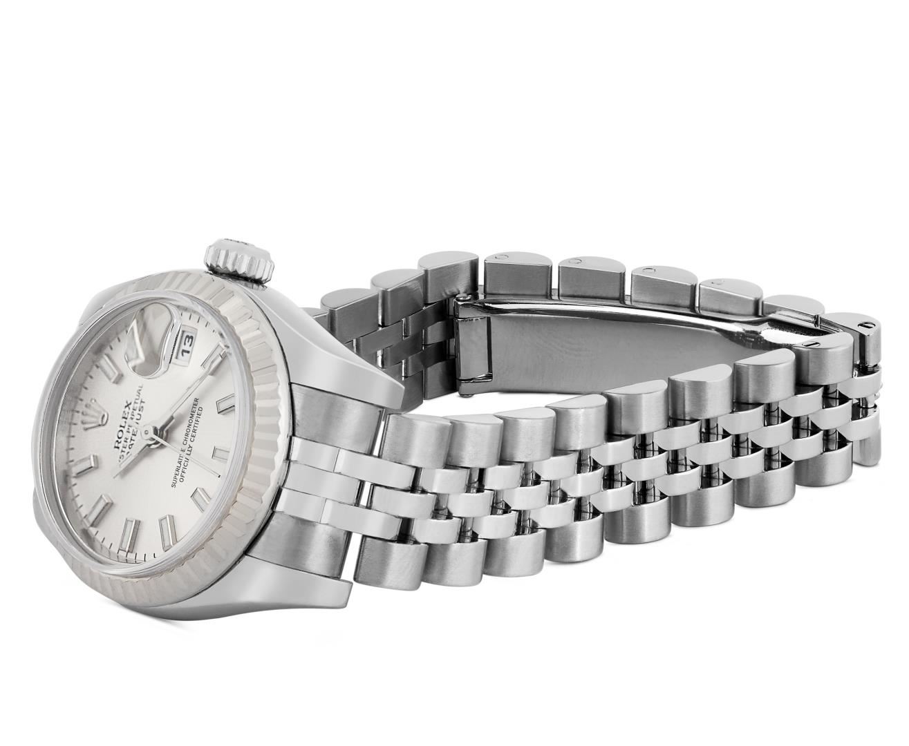 One Ladies Pre Owned Rolex Stainless Steel Datejust Wristwatch Polished Bright with Satin Finish, Serviced & Electronically Tested, Stainless Steel Case: 26mm, Stainless Steel Crown, Rolex Bezel: Rolex 18K White Gold Fluted bezel. Crystal: Sapphire With Magnified Date Window. Hands: Luminescent Hands. Rolex Movement: 2235 Automatic Winding Movement. Rolex Dial: Factory Silver With Index Hour Markers And Dash Tracks. Date Window: 3 O'Clock Position Date Display, Model: Quickset Datejust. Condition: G-6 Extra Fine. Rolex Bracelet: Stainless Steel Jubilee Band. Bright Polish & Satin Finish. 6.0 Inch Length, Adjustable. Hidden Clasp, With Rolex Logo. This Watch Has Been Serviced And Time Tested. It Is In Excellent Condition, Free Of All Scratches And Dents. This Watch Comes With A Rolex Box.