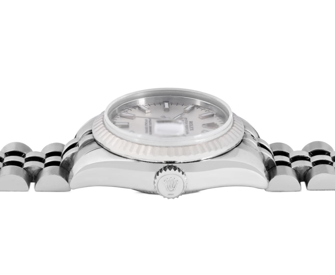One Ladies Pre Owned Rolex Stainless Steel Datejust Wristwatch Polished Bright with Satin Finish, Serviced & Electronically Tested, Stainless Steel Case: 26mm, Stainless Steel Crown, Rolex Bezel: Rolex 18K White Gold Fluted bezel. Crystal: Sapphire With Magnified Date Window. Hands: Luminescent Hands. Rolex Movement: 2235 Automatic Winding Movement. Rolex Dial: Factory Silver With Index Hour Markers And Dash Tracks. Date Window: 3 O'Clock Position Date Display, Model: Quickset Datejust. Condition: G-6 Extra Fine. Rolex Bracelet: Stainless Steel Jubilee Band. Bright Polish & Satin Finish. 6.0 Inch Length, Adjustable. Hidden Clasp, With Rolex Logo. This Watch Has Been Serviced And Time Tested. It Is In Excellent Condition, Free Of All Scratches And Dents. This Watch Comes With A Rolex Box.