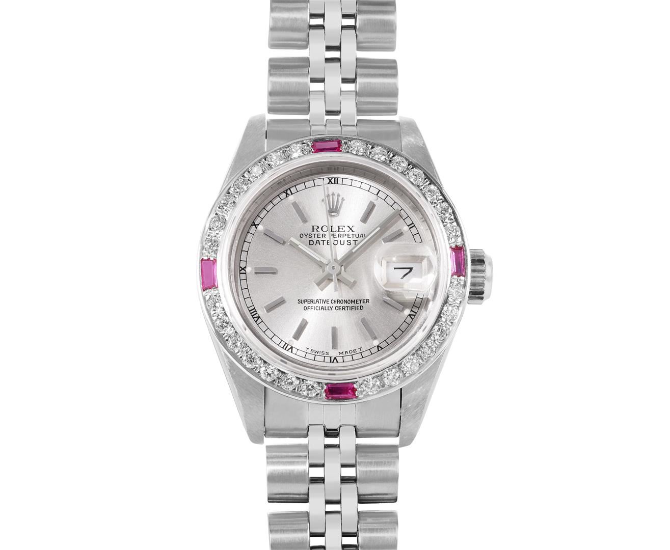 One Rolex Ladies Pre Owned Stainless Steel Datejust Wristwatch Polished Bright with Satin Finish, Serviced & Electronically Tested, Stainless Steel Case: 26mm, Stainless Steel Crown, Custom Bezel: New 18K White Gold Ruby Beadset Diamond Bezel, Diamond + G