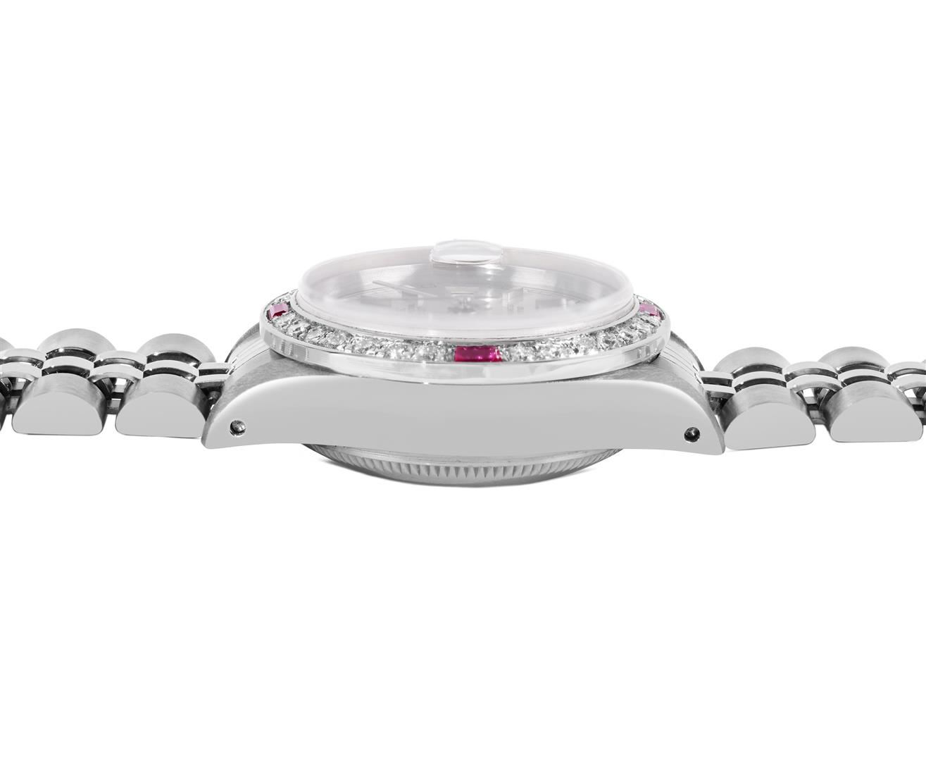 One Rolex Ladies Pre Owned Stainless Steel Datejust Wristwatch Polished Bright with Satin Finish, Serviced & Electronically Tested, Stainless Steel Case: 26mm, Stainless Steel Crown, Custom Bezel: New 18K White Gold Ruby Beadset Diamond Bezel, Diamond + Gem Count: 36 Diamonds + 4 Rubies, Clarity: SI-VS, Color: G to H. Custom Crystal: New Sapphire With Magnified Date Window. Custom Hands: New Luminescent Hands. Rolex Movement: 2135 Automatic Winding Movement. Rolex Dial: Factory Silver Dial With Index Hour Markers, Square Roman Track, and Lumi Dots. Date Window: 3 O'Clock Position Date Display, Model: Quickset Datejust. Condition: G-6 Extra Fine. Rolex Bracelet: Stainless Steel Jubilee Band. Bright Polish & Satin Finish. 6.0 Inch Length, Adjustable. Standard Clasp, With Rolex Logo. This Watch Has Been Serviced Time Tested And Is In Excellent Condition. It Is Free Of All Scratches And Dents.