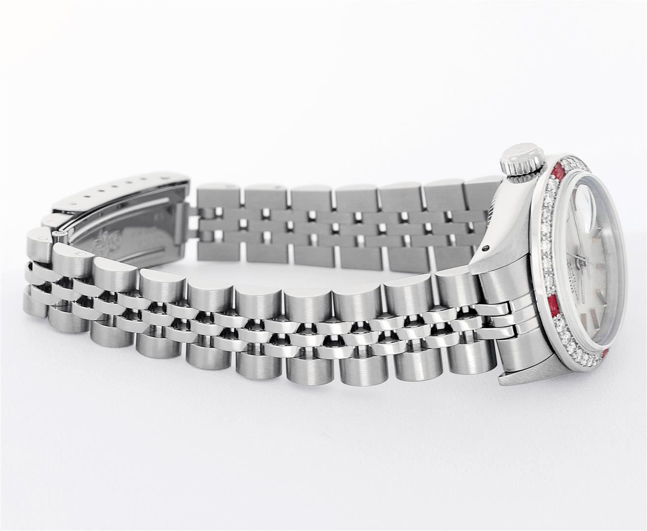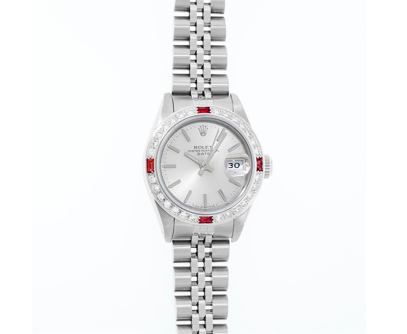 One Ladies Pre Owned Quickset Stainless Steel Rolex Datejust Polished Bright with Satin Finish, Serviced & Electronically Tested, Rolex Stainless Steel Case: 26mm, Rolex Stainless Steel Crown, Custom Bezel: 18K White Gold Beadset Ruby Bezel, Stone Count: 28 Diamonds + 4 Rubies, Diamond Color: G To H, Clarity: SI-VS. Custom Crystal: New Sapphire With Magnified Date Window. Custom Hands: New Luminescent Hands. Rolex Movement: Quickset Automatic Winding Movement 2130. Rolex Dial: Silver Index Dial With Luminescent Dots & Dash Track. Date Window: 3 O'Clock Position Date Display, Model: Sapphire Quickset Datejust. Condition: G-6 Extra Fine. Rolex Bracelet: Stainless Steel Jubilee Band. Bright Polish & Satin Finish. 6.0 Inch Length, Adjustable. Standard Clasp, With Rolex Logo. This Watch Has Been Serviced Time Tested And Is In Excellent Condition It Is Free Of All Scratches And Dents.