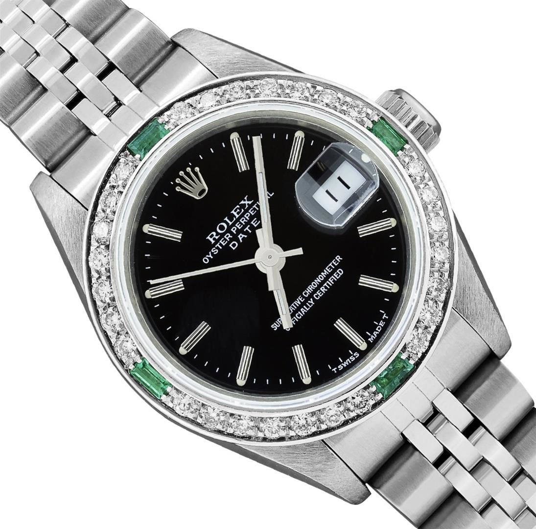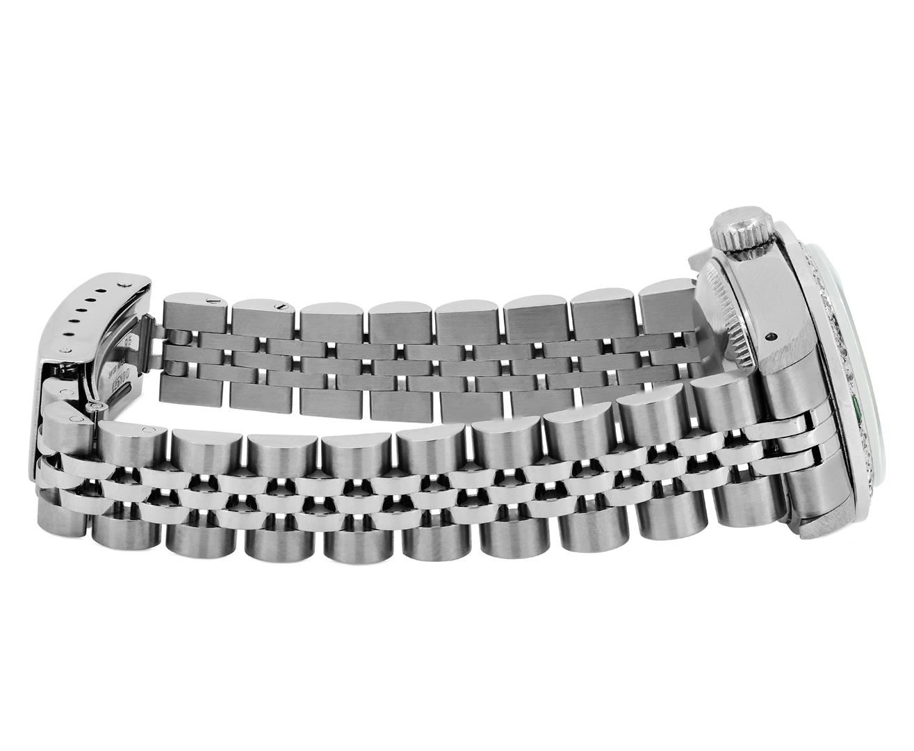 One Rolex Ladies Quickset Pre Owned Stainless Steel Date Wristwatch Polished Bright with Satin Finish, Serviced & Electronically Tested, Stainless Steel Case: 26mm, Stainless Steel Crown, Custom Bezel: New 18K White Gold Emerald Beadset Diamond Bezel, Diamond + Gem Count: 36 Diamonds + 4 Emeralds, Clarity: SI-VS, Color: G to H. Custom Crystal: New Sapphire With Magnified Date Window. Custom Hands: New Luminescent Hands. Rolex Movement: 2135 Automatic Winding Movement. Rolex Dial: Factory Black Dial With Index Hour Markers And Lumi Dots. Date Window: 3 O'Clock Position Date Display, Model: Quickset Datejust. Condition: G-6 Extra Fine. Rolex Bracelet: Stainless Steel Jubilee Band. Bright Polish & Satin Finish. 6.0 Inch Length, Adjustable. Standard Clasp, With Rolex Logo. This Watch Has Been Serviced And Time Tested. It Is In Excellent Condition, Free Of All Scratches And Dents. This Watch Comes With A Rolex Box.