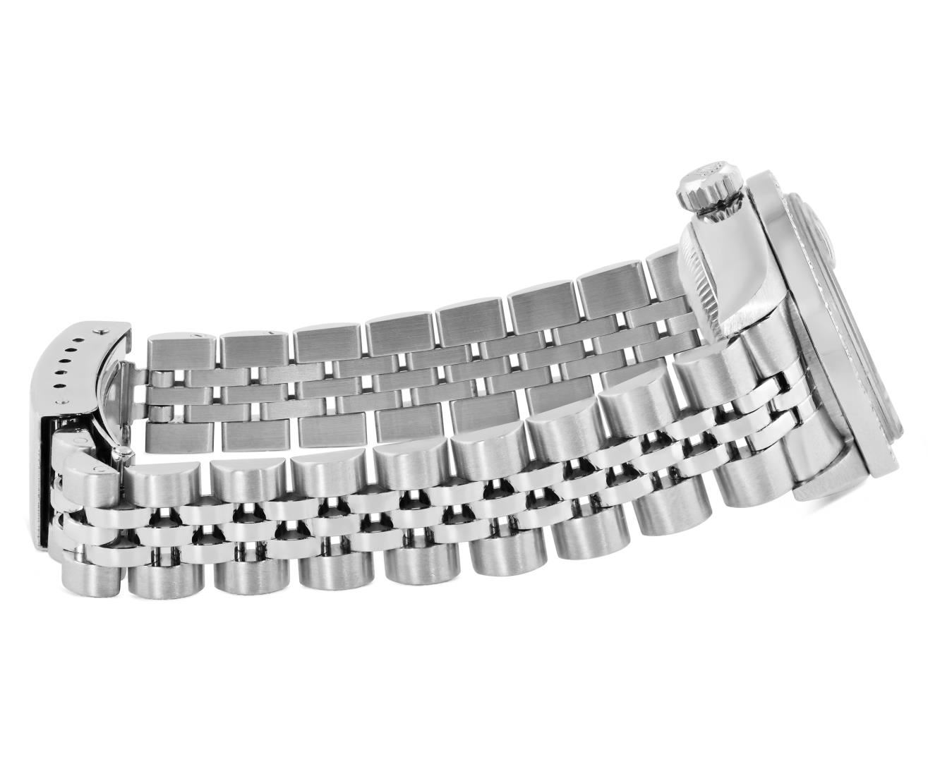 One Rolex Ladies Quickset Pre Owned Stainless Steel Date Wristwatch Polished Bright with Satin Finish, Serviced & Electronically Tested, Stainless Steel Case: 26mm, Stainless Steel Crown, Custom Bezel: New Stainless Steel Beadset Diamond Bezel, Diamond Co