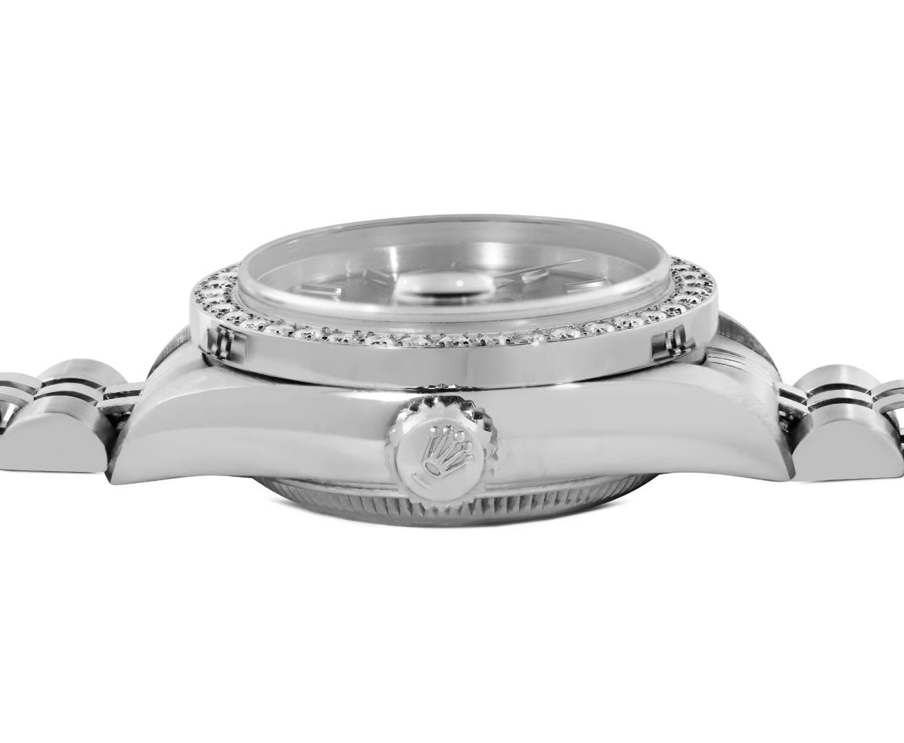 One Rolex Ladies Quickset Pre Owned Stainless Steel Date Wristwatch Polished Bright with Satin Finish, Serviced & Electronically Tested, Stainless Steel Case: 26mm, Stainless Steel Crown, Custom Bezel: New Stainless Steel Beadset Diamond Bezel, Diamond Count: 40 Diamonds On Bezel. Custom Crystal: New Sapphire With Magnified Date Window. Hands: Luminescent Hands. Rolex Movement: 2235 Automatic Winding Movement. Rolex Dial: Factory Black Dial With Index Hour Markers And Lumi Dots. Date Window: 3 O'Clock Position Date Display, Model: Quickset Sapphire Date. Condition: G-6 Extra Fine. Rolex Bracelet: Stainless Steel Jubilee Band. Bright Polish & Satin Finish. 6.0 Inch Length, Adjustable. Standard Clasp, With Rolex Logo. This Watch Has Been Serviced And Time Tested. It Is In Excellent Condition, Free Of All Scratches And Dents.