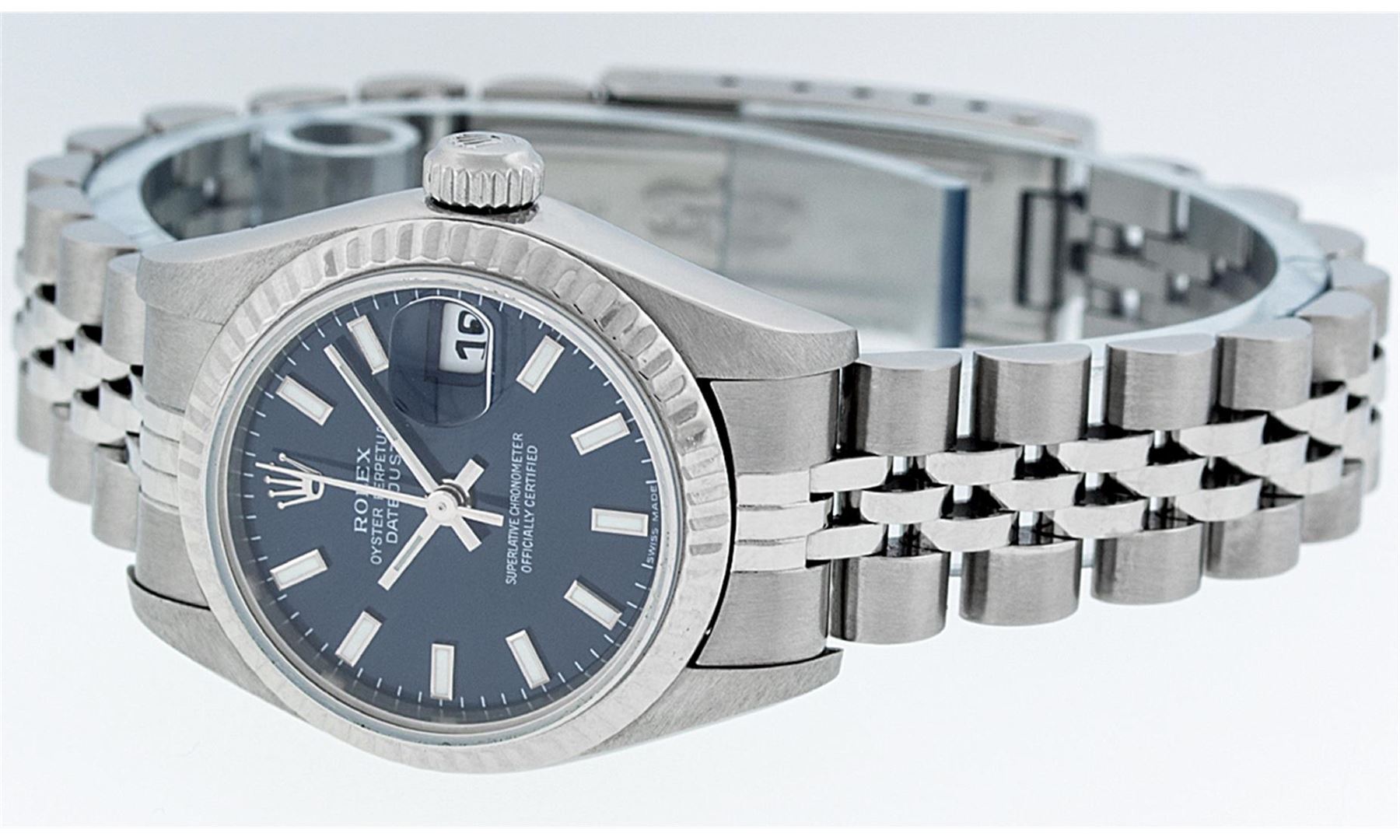 One Ladies Pre Owned Quickset Stainless Steel Rolex Datejust Polished Bright with Satin Finish, Serviced & Electronically Tested, Stainless Steel Case: 26mm, Stainless Steel Crown, Bezel: 18K White Gold Fluted Bezel. Custom Crystal: New Sapphire With Magnified Date Window. Custom Hands: New Luminescent Hands. Rolex Movement: Automatic Winding Movement. Custom Dial: Refinished To Blue With Custom Index Hour Markers And Dash Track . Date Window: 3 O'Clock Position Date Display, Model: Quickset Datejust. Condition: G-6 Extra Fine. Rolex Bracelet: Stainless Steel Jubilee Band. Bright Polish & Satin Finish. 6.0 Inch Length, Adjustable. Standard Clasp, With Rolex Logo. This Watch Has Been Serviced Time Tested And Is In Excellent Condition It Is Free Of All Scratches And Dents.