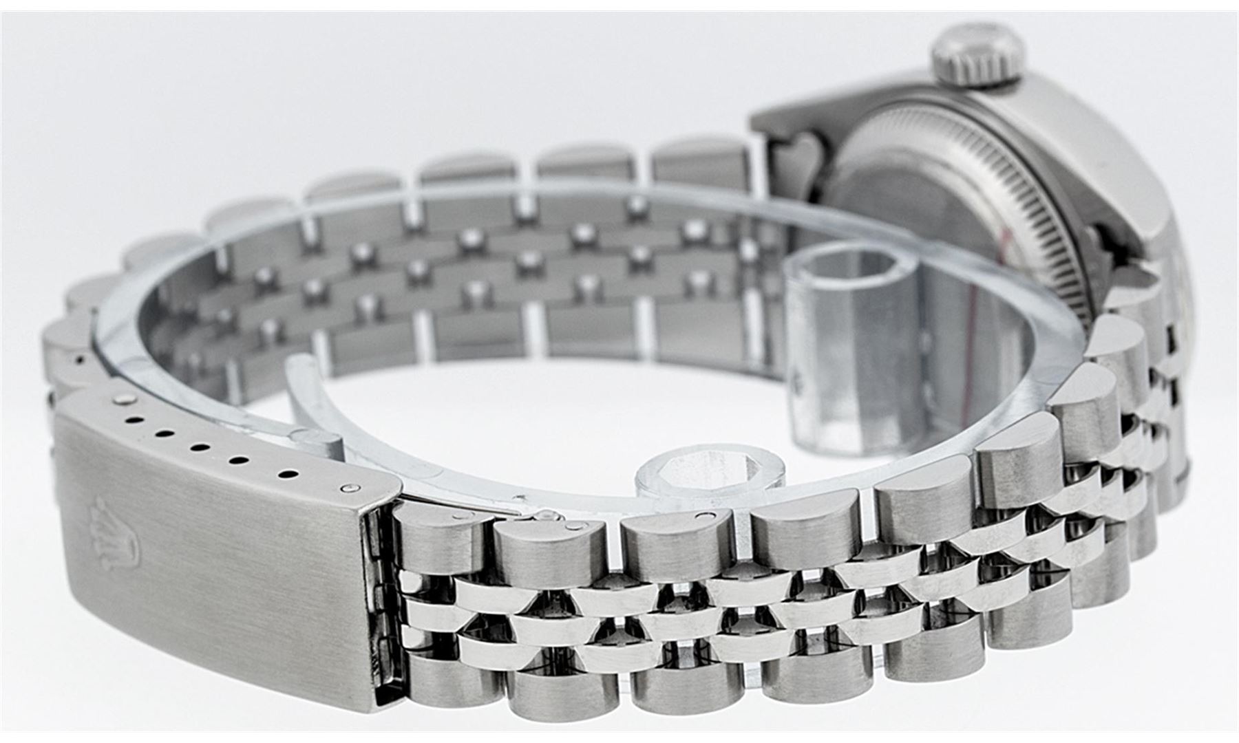 One Ladies Pre Owned Quickset Stainless Steel Rolex Datejust Polished Bright with Satin Finish, Serviced & Electronically Tested, Stainless Steel Case: 26mm, Stainless Steel Crown, Bezel: 18K White Gold Fluted Bezel. Custom Crystal: New Sapphire With Magnified Date Window. Custom Hands: New Luminescent Hands. Rolex Movement: Automatic Winding Movement. Custom Dial: Refinished To Blue With Custom Index Hour Markers And Dash Track. Date Window: 3 O'Clock Position Date Display, Model: Quickset Datejust. Condition: G-6 Extra Fine. Rolex Bracelet: Stainless Steel Jubilee Band. Bright Polish & Satin Finish. 6.0 Inch Length, Adjustable. Standard Clasp, With Rolex Logo. This Watch Has Been Serviced Time Tested And Is In Excellent Condition It Is Free Of All Scratches And Dents.