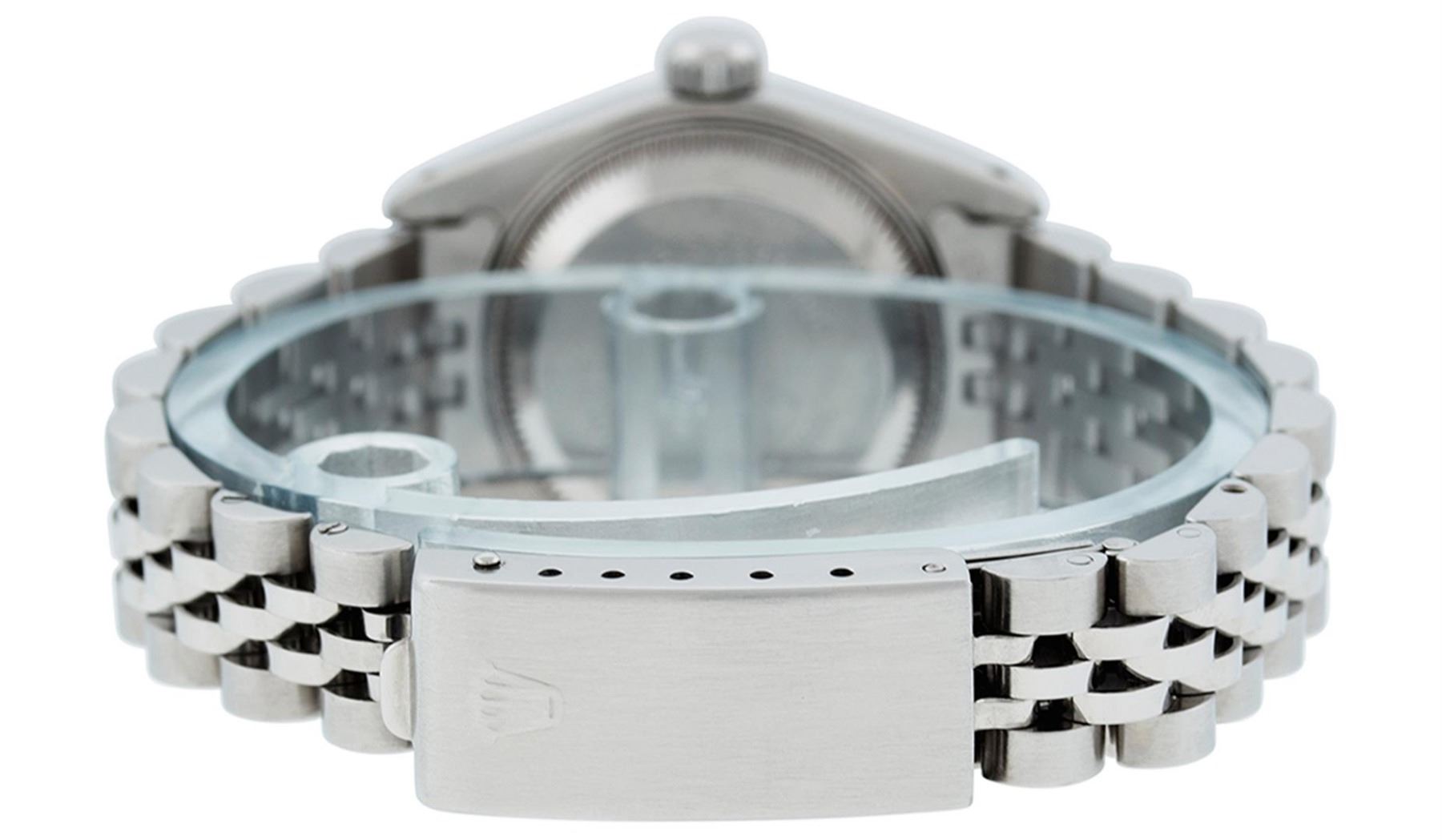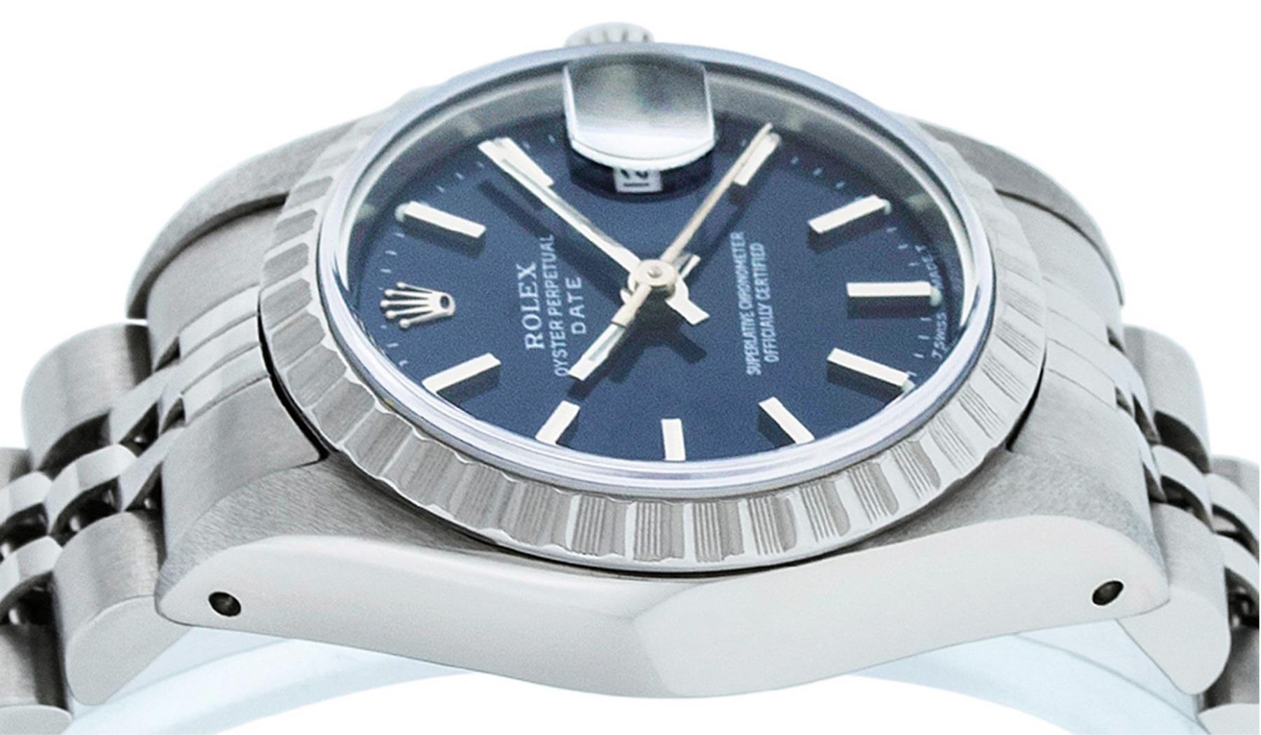 One Ladies Pre Owned Quickset Stainless Steel Rolex Date Polished Bright with Satin Finish, Serviced & Electronically Tested, Rolex Stainless Steel Case: 26mm, Rolex Stainless Steel Crown, Rolex Bezel: Stainless Steel Engine Turn Bezel. Crystal: Sapphire With Magnified Date Window. Hands: Luminescent Hands. Rolex Movement: Automatic Winding Movement 2230. Rolex Dial: Blue Index Dial With Luminescent Dots & Dash Track. Date Window: 3 O'Clock Position Date Display, Model: Sapphire Quickset Date Caliber 2230. Condition: G-6 Extra Fine. Rolex Bracelet: Stainless Steel Jubilee Band. Bright Polish & Satin Finish. 6.0 Inch Length, Adjustable. Standard Clasp, With Rolex Logo. This Watch Has Been Serviced Time Tested And Is In Excellent Condition It Is Free Of All Scratches And Dents.