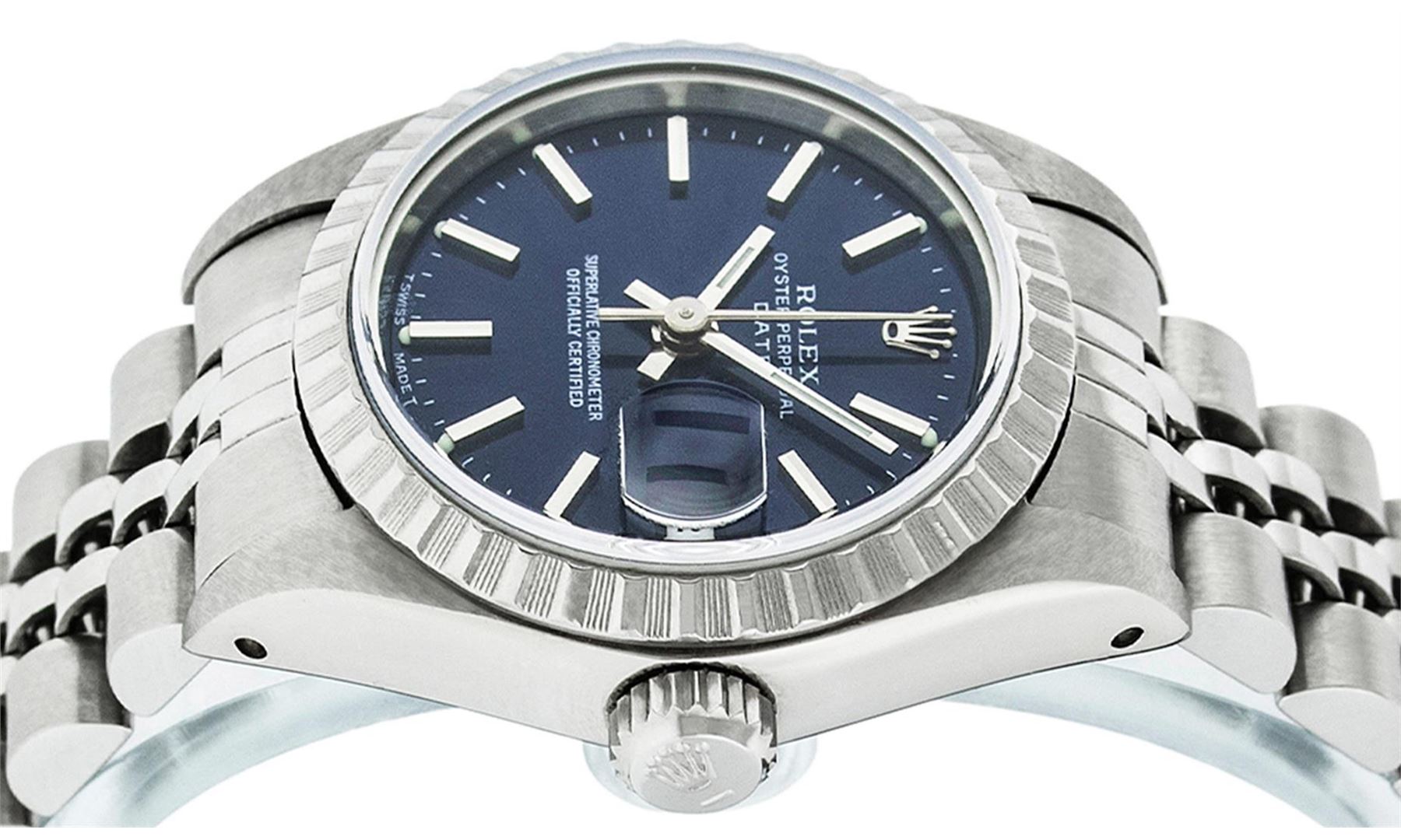 One Ladies Pre Owned Quickset Stainless Steel Rolex Date Polished Bright with Satin Finish, Serviced & Electronically Tested, Rolex Stainless Steel Case: 26mm, Rolex Stainless Steel Crown, Rolex Bezel: Stainless Steel Engine Turn Bezel. Crystal: Sapphire With Magnified Date Window. Hands: Luminescent Hands. Rolex Movement: Automatic Winding Movement 2230. Rolex Dial: Blue Index Dial With Luminescent Dots & Dash Track. Date Window: 3 O'Clock Position Date Display, Model: Sapphire Quickset Date Caliber 2230. Condition: G-6 Extra Fine. Rolex Bracelet: Stainless Steel Jubilee Band. Bright Polish & Satin Finish. 6.0 Inch Length, Adjustable. Standard Clasp, With Rolex Logo. This Watch Has Been Serviced Time Tested And Is In Excellent Condition It Is Free Of All Scratches And Dents.