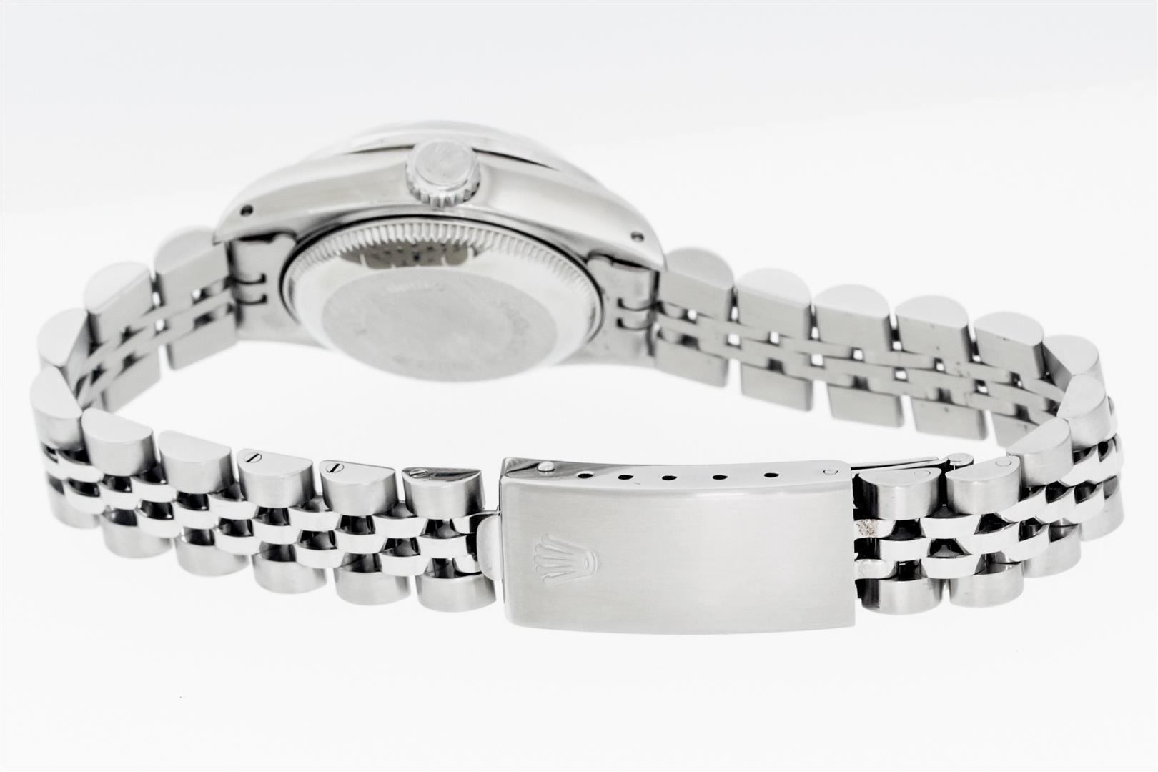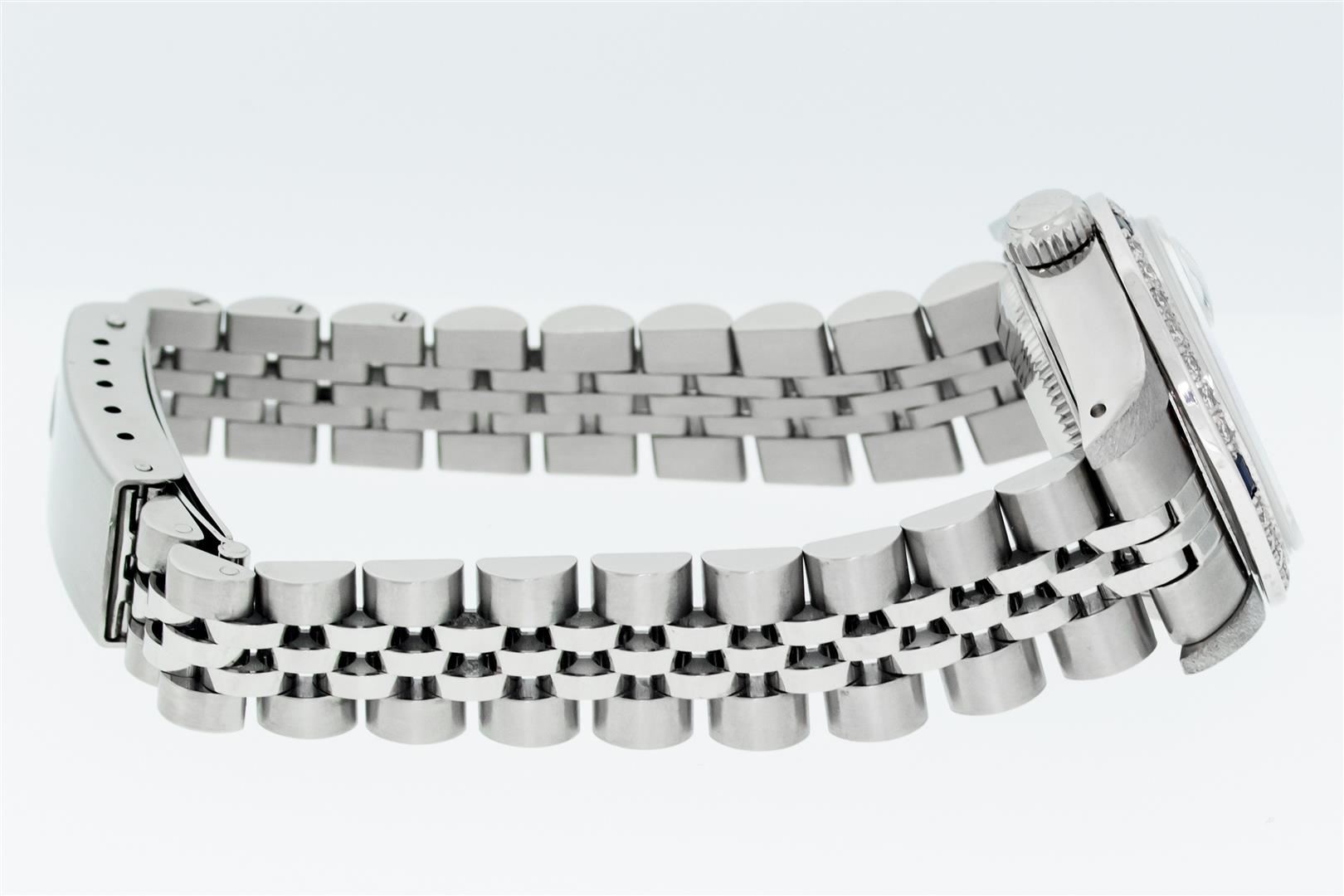 One Ladies Pre Owned Quickset Stainless Steel Rolex Datejust Polished Bright with Satin Finish Serviced & Electronically Tested, Rolex Stainless Steel Case: 26mm, Rolex Stainless Steel Crown, Custom Bezel: New White Gold Beadset + Sapphire Diamond Bezel, Diamond Count: 28 Diamonds + 4 Sapphire Bezels. Custom Crystal: New Sapphire With Date Window. Custom Hands: New Luminescent Hands. Rolex Movement: Automatic Winding Movement. Rolex Dial: Blue Index Dial With Dash Track. Date Window: 3 O'Clock Position Date Display, Model: Datejust. Condition: G-6 Extra Fine. Rolex Bracelet: Stainless Steel Jubilee Band With Rolex Crown On Buckle. Bright Polish & Satin Finish. Band Length: 6.0 Inch Length, Adjustable. Standard Clasp, With Rolex Logo. This Watch Has Been Serviced Time Tested And Is In Excellent Condition It Is Free Of All Scratches And Dents.